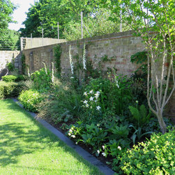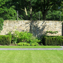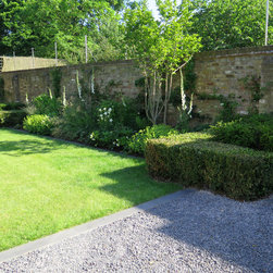 The fox issue has been addressed through the construction of a stainless-steel wire system which also supports the many climbers which have been planted along the boundary. Two multi-stem Magnolias have been planted within the beds and a lovely Persian Ironwood tree has been planted as a focal point from the drawing room windows.