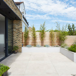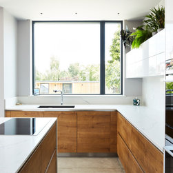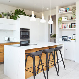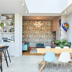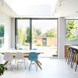At ground floor we removed a large downstairs bathroom (a legacy from the property previously being subdivided) which generated space for a dedicated utility & laundry room, and also allowed us to increase the size of the existing rear dining room, to provide a large informal family lounge. A wraparound side infill and rear extension were added to enable a new, light, dining area, with direct access to a new raised terrace, and also allowed a large knock-through to a new extended open-plan kitchen.