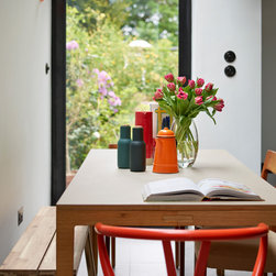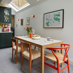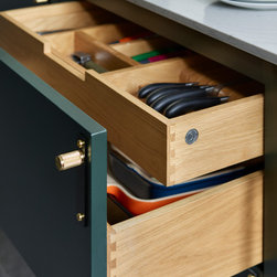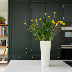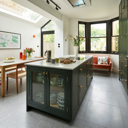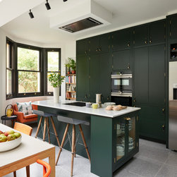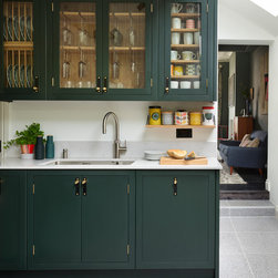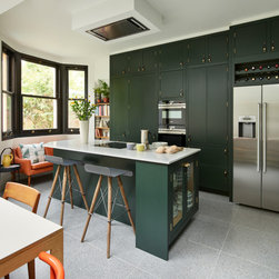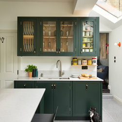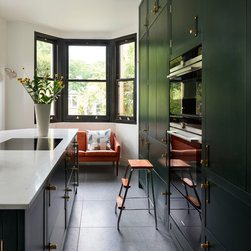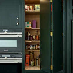 This repeat client in a victorian terrace wanted to maximise the storage in her new kitchen. Every detail has been thought through to ensure everything has its place. From the 2 bifold pantries either side of the ovens which open up to increase the worktop space to the sink run with its carefully thought out cupboards- one for mugs, one for plates and one for wine glasses. This kitchen epitomises bespoke design - furniture designed and tailor made to suit the clients needs.