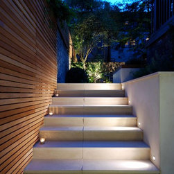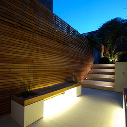 The solution was to create a contemporary style terrace and BBQ area at the lower level with bespoke seating, extensive timber screens covering the existing painted brick walls, dramatic lighting and a much widened staircase up to the main garden.