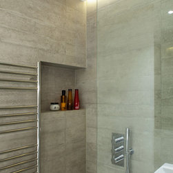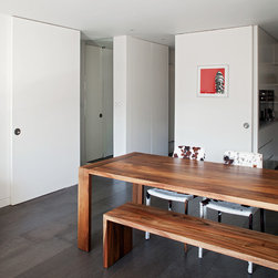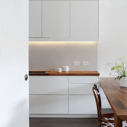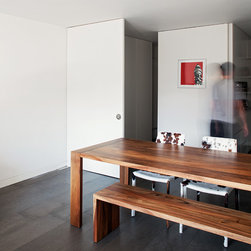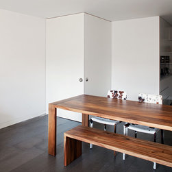 The materials have been selected to complement each other and to create a homogenous living environment where grey concrete tiles are juxtaposed to spray lacquered vertical surfaces and the walnut kitchen counter adds and earthy touch and is contrasted with a painted splashback.