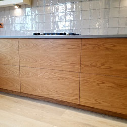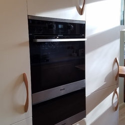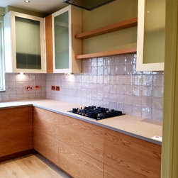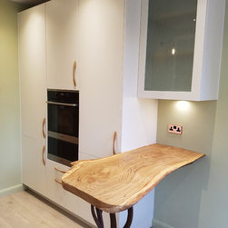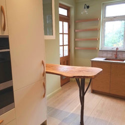 This artistic client wanted a kitchen that would brighten up the room, be practical, organic and add character. She designed the branch like leg for the breakfast bar herself and we had it locally made and sourced a wonderful piece of reclaimed oak to rest on it. The kitchen furniture is oak veneered and white matt lacquer. The oak is bookmatched along the base units giving a real feeling of flow to the kitchen. The wall cupboards were designed using safety glass to give a retro feel but also to partially obscure what is inside. This is a quirky kitchen with bags of character that the client adores.
