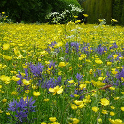claudia de yong designs- close up of buttercups and camassia flowering in wildflower meadows at West Dean Gardens in Sussex