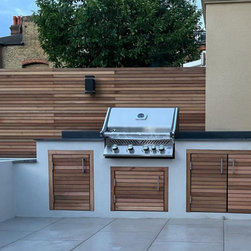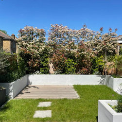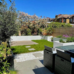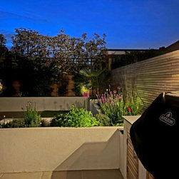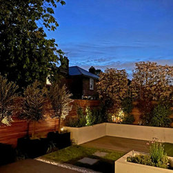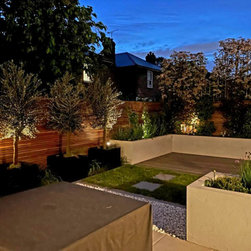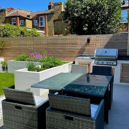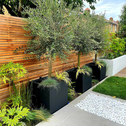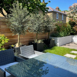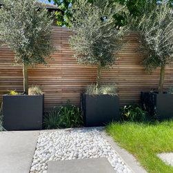A small contemporary garden with a Mediterranean feel to it. Surrounded by raised beds, outdoor barbeque/ kitchen next to house, the garden has a focal point three large pots with architectural olive trees planted on them. On the back large photinia pleached trees to create privacy to the clients