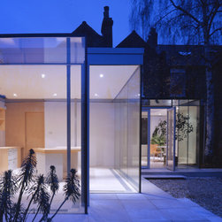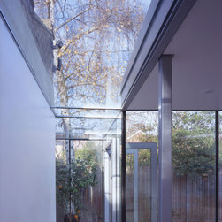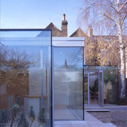 The new garden room and studio extension are formed by ‘capturing’ the external garden space within a continuous transparent glass edge that runs the entire width of the house. Its meandering path is formed by negotiating the new programme of spaces, the existing building, and the landscaping and trees that are contained between the site boundaries. Internally the ground floor spaces are modified to centre the kitchen at the heart of the new plan.