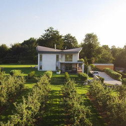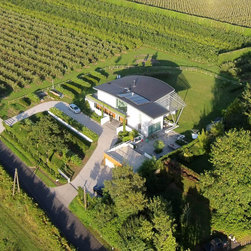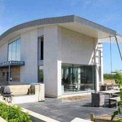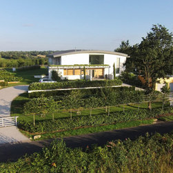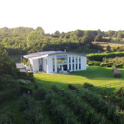 Wings is a replacement 4 bedroom property for a retired Pilot and his wife. The striking butterfly roof was inspired by the profile of an aircraft wing. The roof was designed to harness solar energy via roof mounted photovoltaics and to maximise views to the North and South of the site. The large overhang along the South elevation provides solar shading, minimising overheating in summer whilst maximising sunlight in winter months to passively heat the building. The new house is proving to be highly efficient and sustainable as predicted.