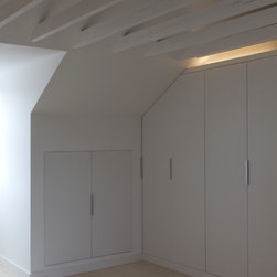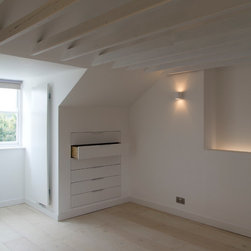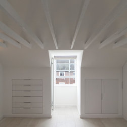 The open plan room is transformed by losing the attic space above the rafter ties: the ceiling was removed and the roof structure revealed to enhance the intrinsic character of the attic space through the exposure of the ceiling structure and the now exposed roof shape.