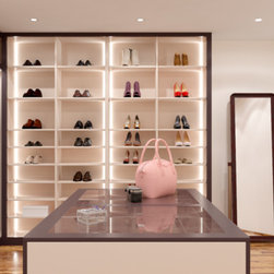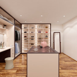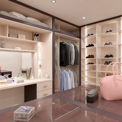 This walk-in dressing room comes with shoe shelves, soft close drawers and drawer organizers. There are transparent drawer tops with built-in organizers. The ergonomically designed walk-in wardrobe also comes with a dressing table. The dressing room looks bright and lovely with the LED lighting. The notable point is, this walk-in wardrobe's layout can be tailor made to your needs. Contact us order one for you!