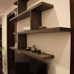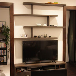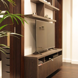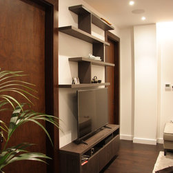 Wood veneer custom made media unit with floating shelves and wardrobe