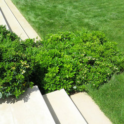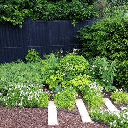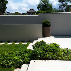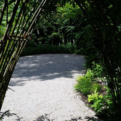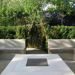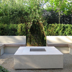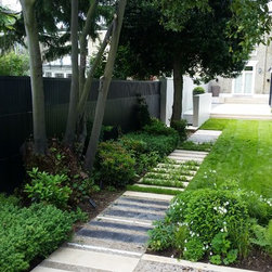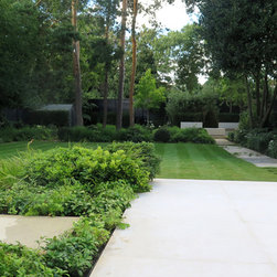 Limestone strips set within gravel paths connect the different zones of the garden and lead the eye to the bottom of the garden increasing the appearance of space.