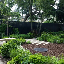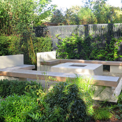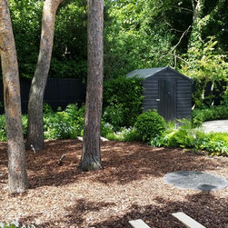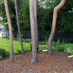 This 375 sq m North facing family garden in Putney was designed around a stand of five mature Scots Pine trees situated towards the rear of garden. The owner had young children so wanted as large a lawn as possible without compromising the trees or the look of the garden and this was one of the key challenges facing Charlotte Rowe Garden Design. Wide beds, planted with shade-loving perennials, ferns and grasses, wrap around these trees creating a soft, woodland feel to this contemporary London garden. A living willow tunnel and seating area with fire pit are situated within the woodland area. A children’s play area is also situated towards the end of the garden with plenty of space for climbing frame and trampoline.