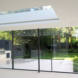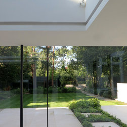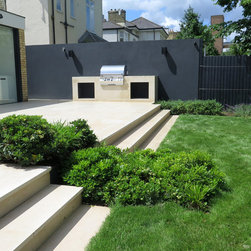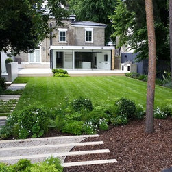 In the sunnier areas of the garden a large rectangular lawn leads back towards the house where a generous limestone terrace wraps around the new glass kitchen and dining room extension, allowing space for a large dining table with built-in BBQ as well as outdoor sofas. The same stone continues from the inside out, creating a flow around the entire rear of the house and bringing the garden into the living space.