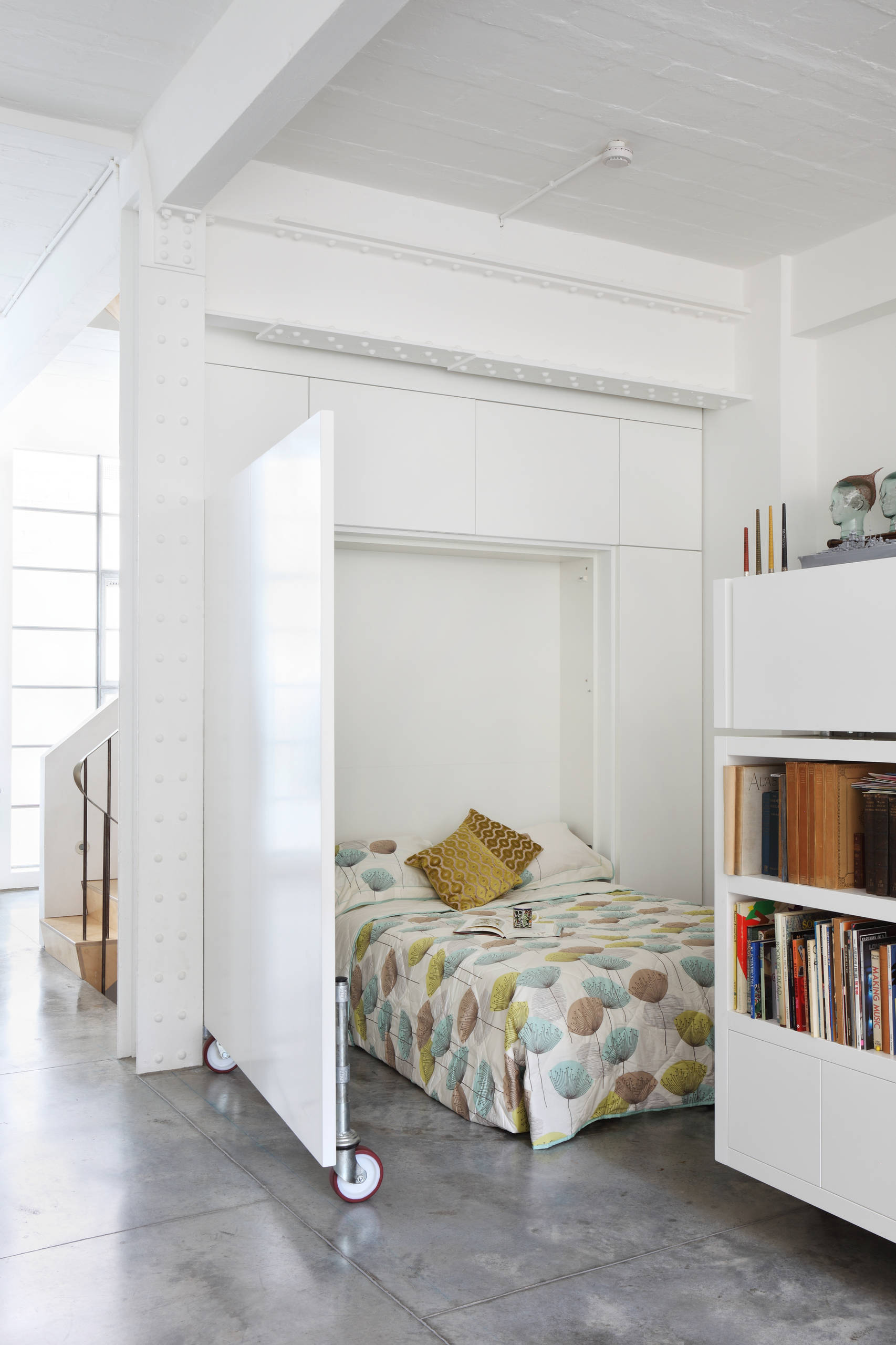 Instead of a typical drop-down door, a side-opening one on lockable wheels can offer a degree of privacy when your bed’s in use – which is particularly useful in an open-plan space.