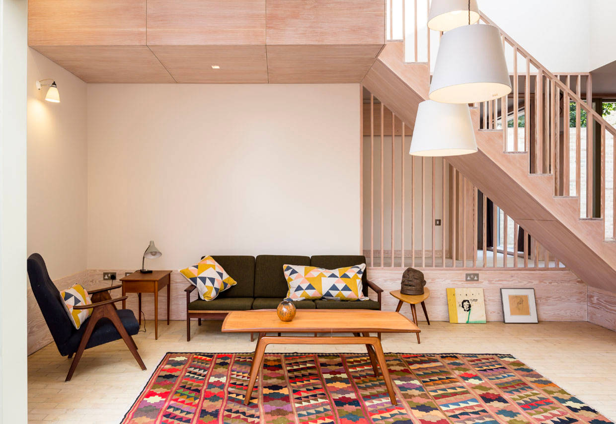 A patterned rug is a great way to introduce texture and balance to a pared-back, modern look. This colourful design warms up the space with red and mauve tones, while the geometric pattern plays up the clean lines of the room’s architecture.