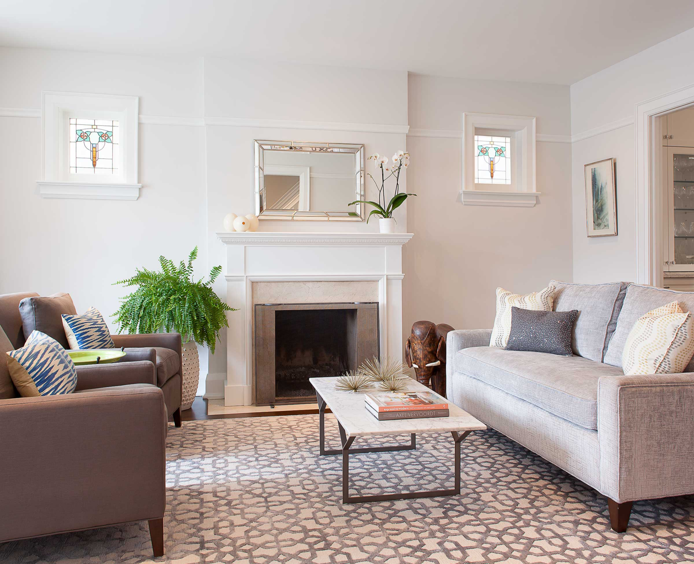 Use a patterned rug as the starting point of your decorative scheme. Pull out the colours and use them in the rest of the space by choosing cushions, art and furnishings that work tonally. In this room, there’s a wealth of pattern, but the carefully edited, cohesive colour palette makes it feel restful.