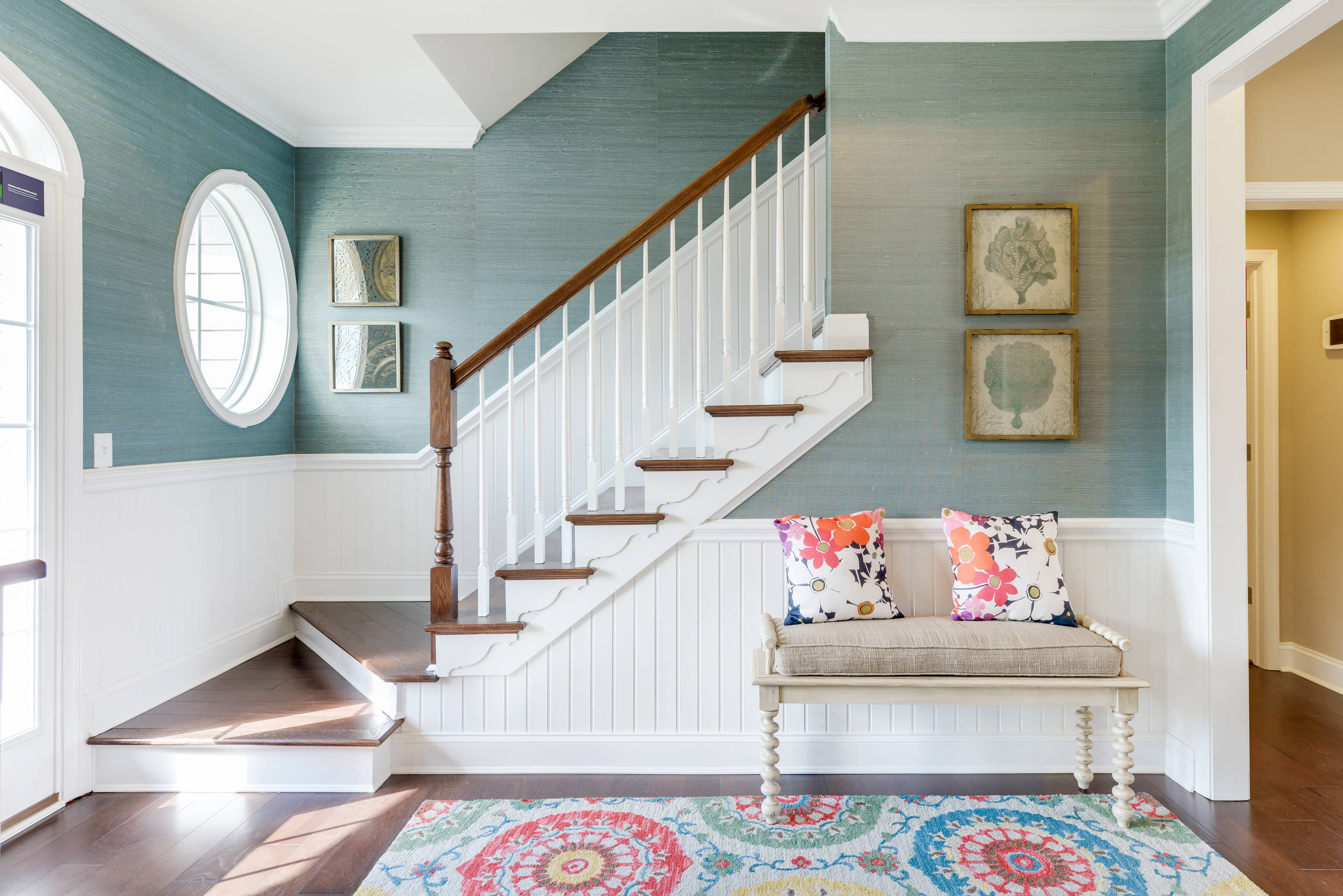 Entrance halls are the perfect place to inject some colour and pattern using a bold rug. As you’ll always be moving through the space, you’re unlikely to tire of it. The trick is to keep the other details elegantly simple. In this sunny entrance, a textural grass cloth wallpaper in a beautiful smoky blue is the perfect backdrop to the vibrant rug, which becomes a confident, considered detail.