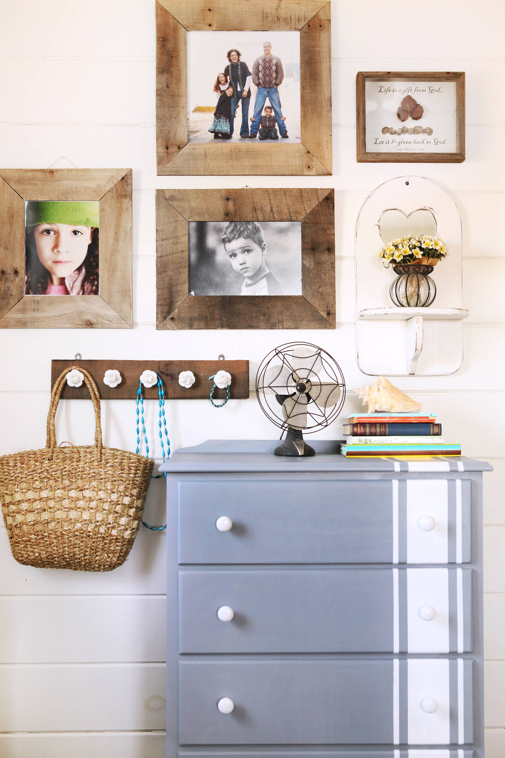 Again, this is one for an experienced woodworker, as it will require specialist tools to cut the angles of the frames. The little row of hooks, below, however is a quicker job. Ask your designer or carpenter to cut a piece of pallet to the length you require, sand and treat it to your taste, and attach nice-looking drawer knobs (or simple coat hooks if you prefer) in a row. Choose the kind of wall fixing you want (these ones are visible above the wood, but you can also get fixings that hide behind it). Et voilà!