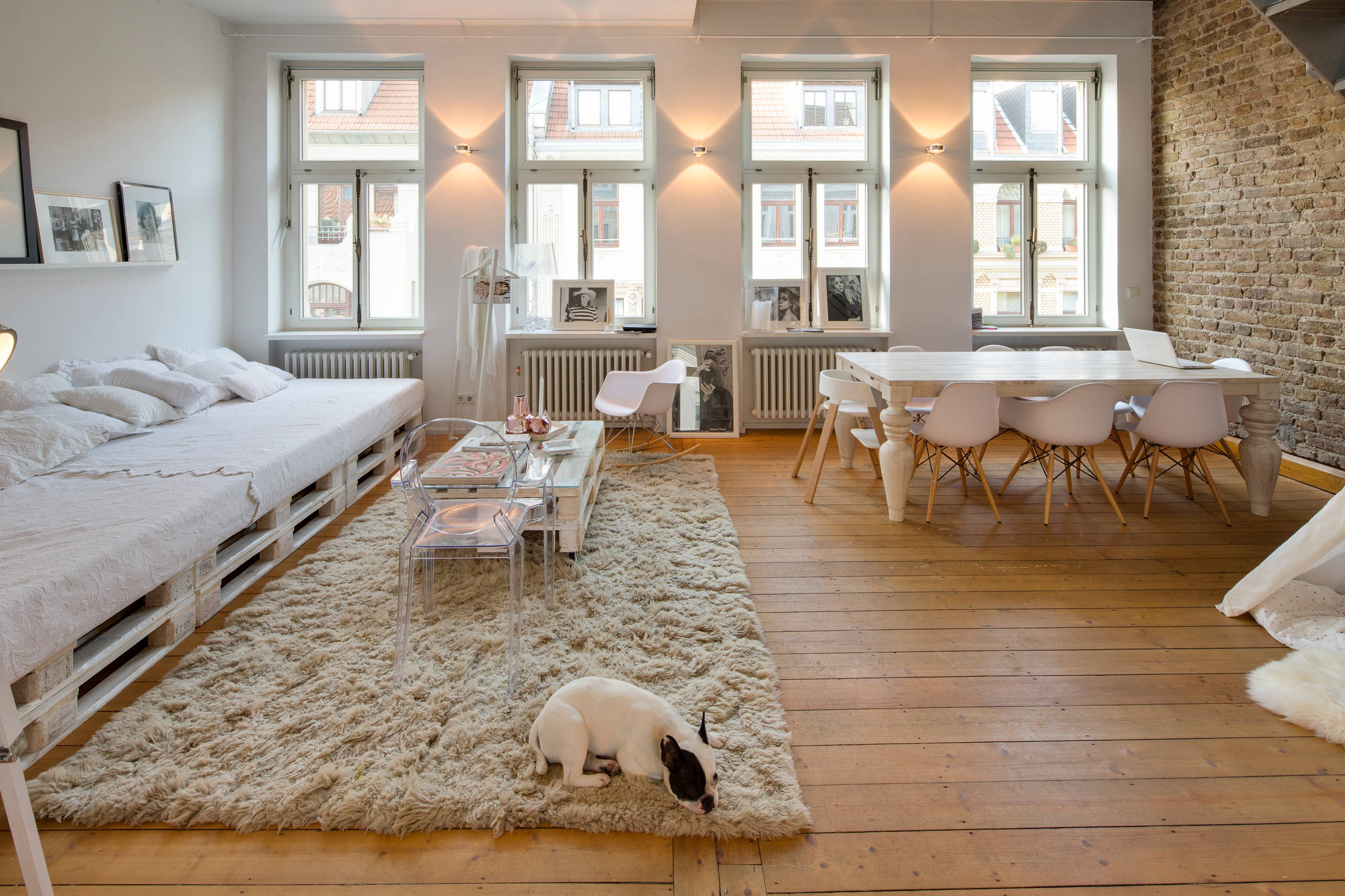 Choose your covering with care to avoid anything that looks too studenty. Here, some beautiful, pale linen does the job, and colour-coordinated cushions add to the soft, Scandi feel of this large living space.