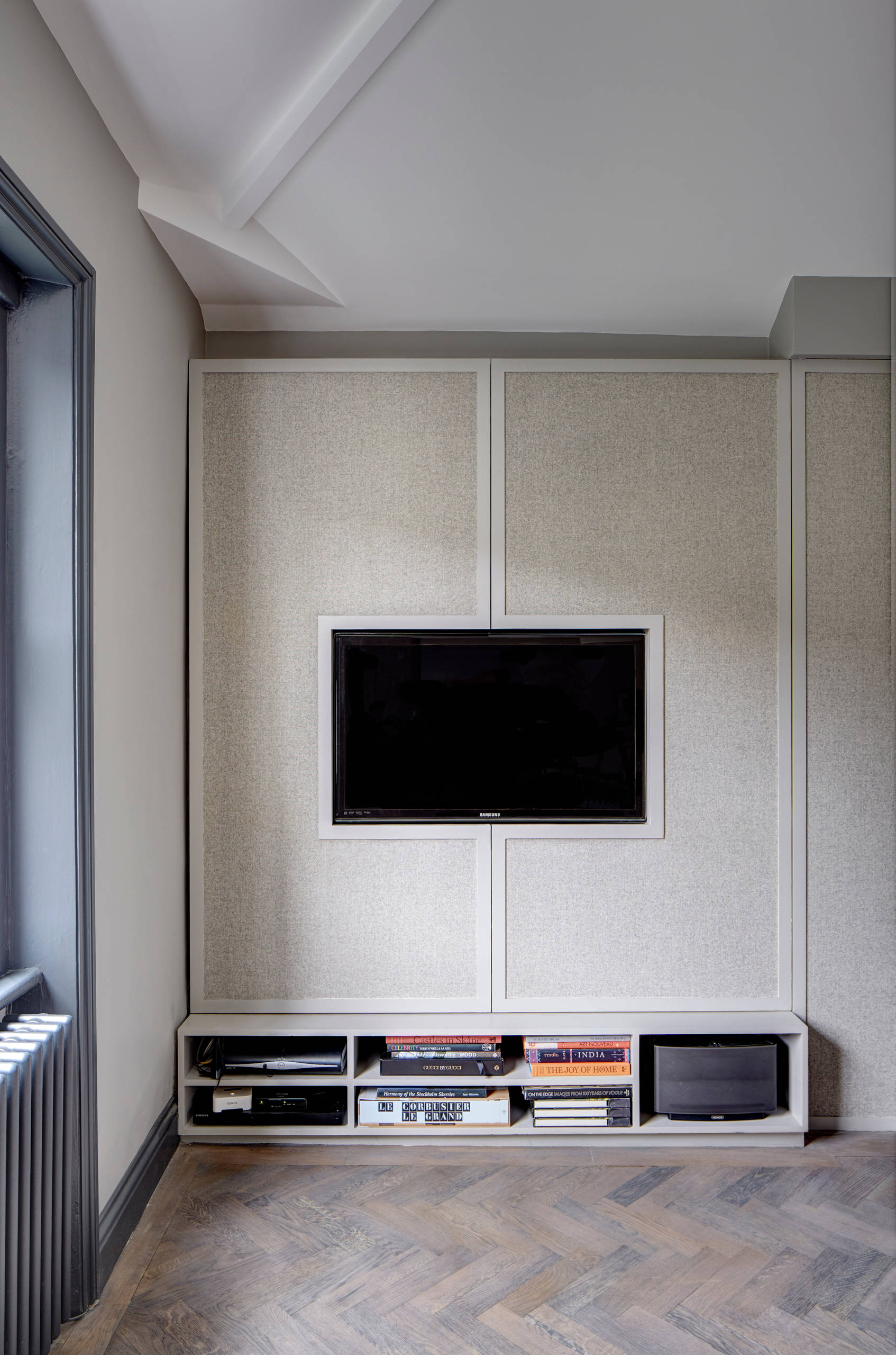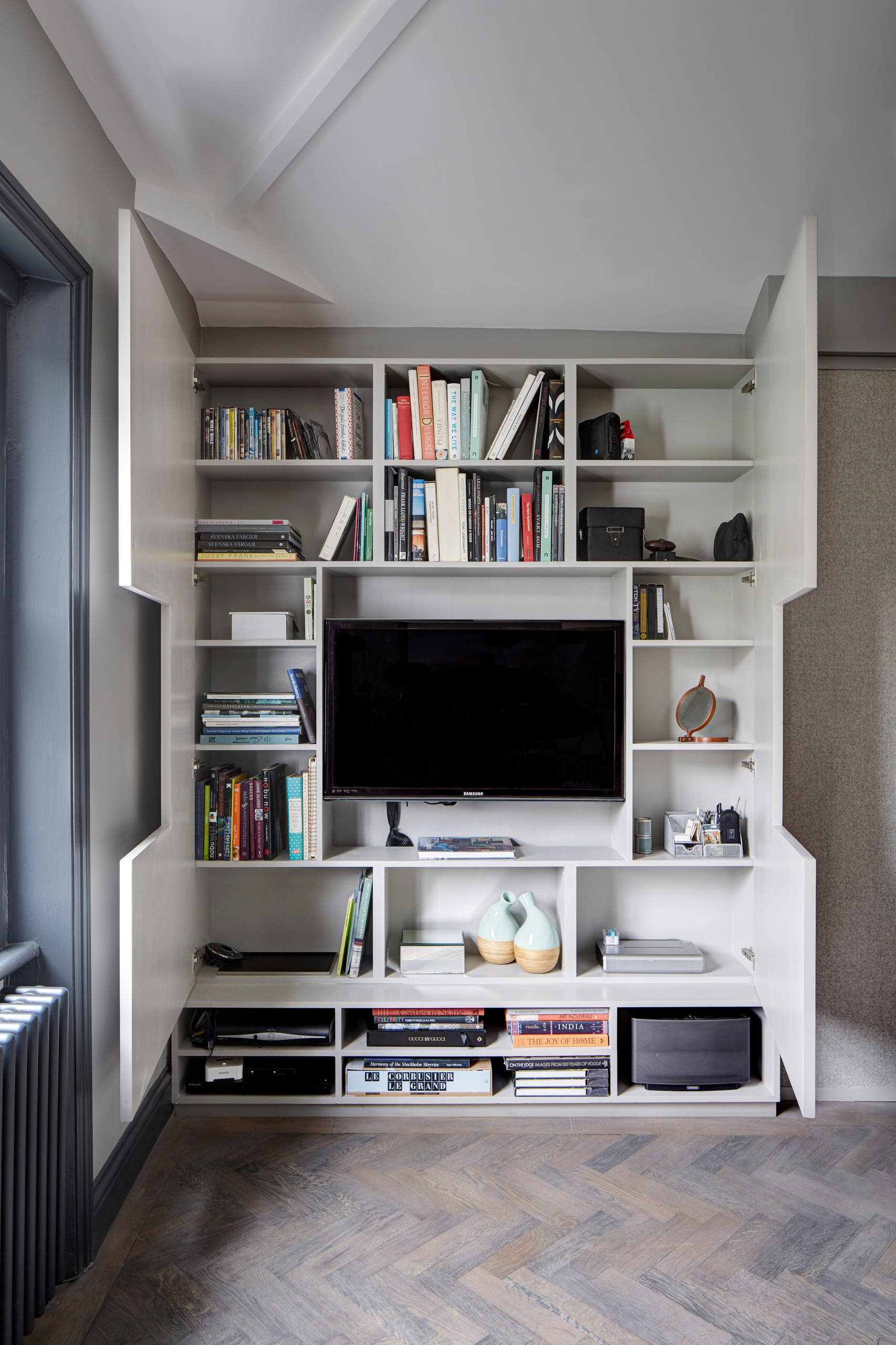 This alcove storage has been cleverly designed with a cut-out section for the TV screen. Below, the key consoles and pieces of tech are neatly stowed, but the doors also open to reveal further storage…