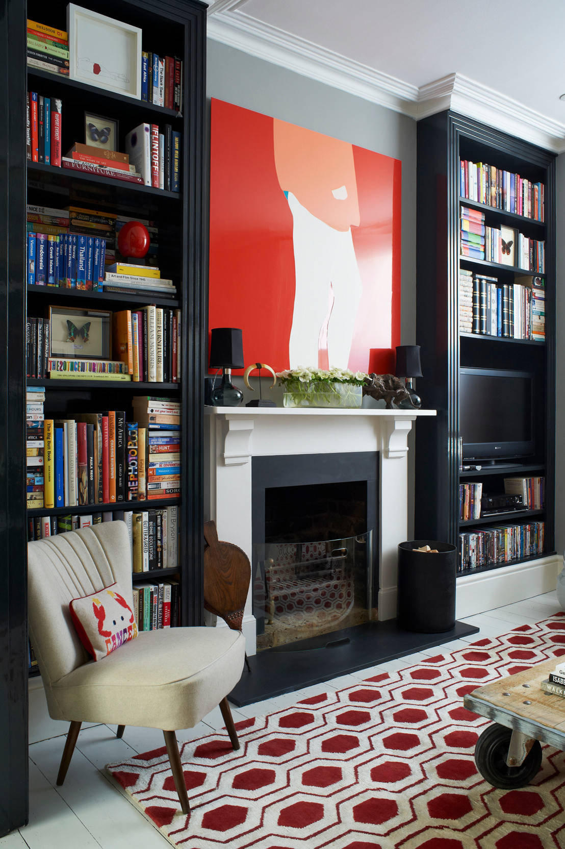 Depending on the depth of a chimney breast and its flue, there may be space to build shelves in above the fireplace, but if you don’t want to lose this surface for displaying art or hanging a mirror, consider doing both! This home has a gorgeous painting over the fire. So far, so normal… Behind, though, shallow shelves for books are neatly built in.
