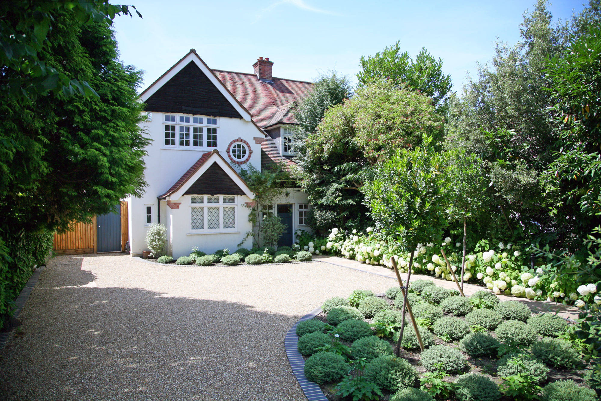 The gentle curves of this gravel driveway cleverly soften the overall look of the property, drawing the eye towards the front door. What could easily have been a large paved expanse has been turned into a beautifully designed garden landscape, while still remaining incredibly practical.