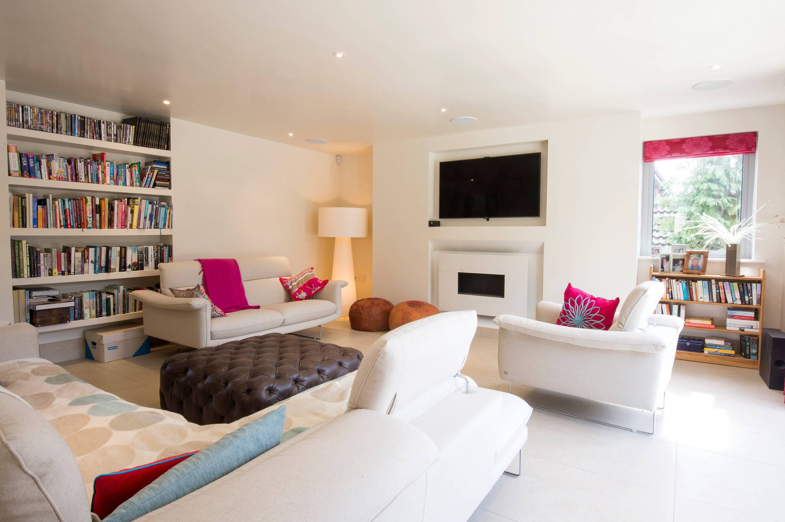 Often the living space you have will dictate the layout you go for. Our homes are getting smaller, so we need to be more creative. In this compact room, a built-in sofa utilises every inch, and eliminates those dusty, wasted gaps between skirting and sofa-back. Integrated bookcases and a wall-mounted cabinet similarly keep everything off the floor, for a sleek and tidy space.
