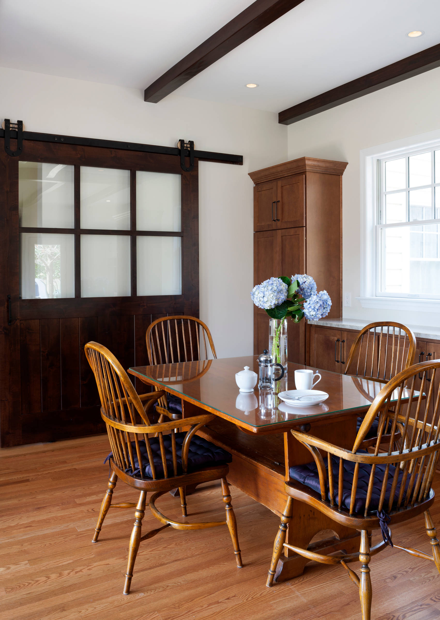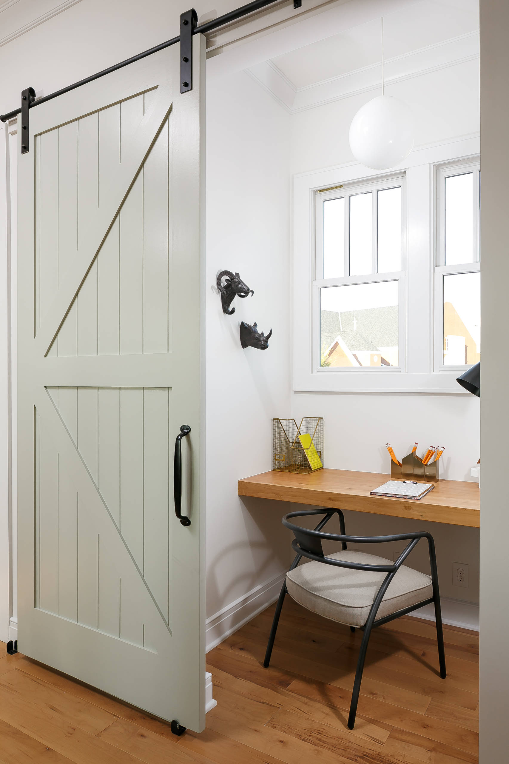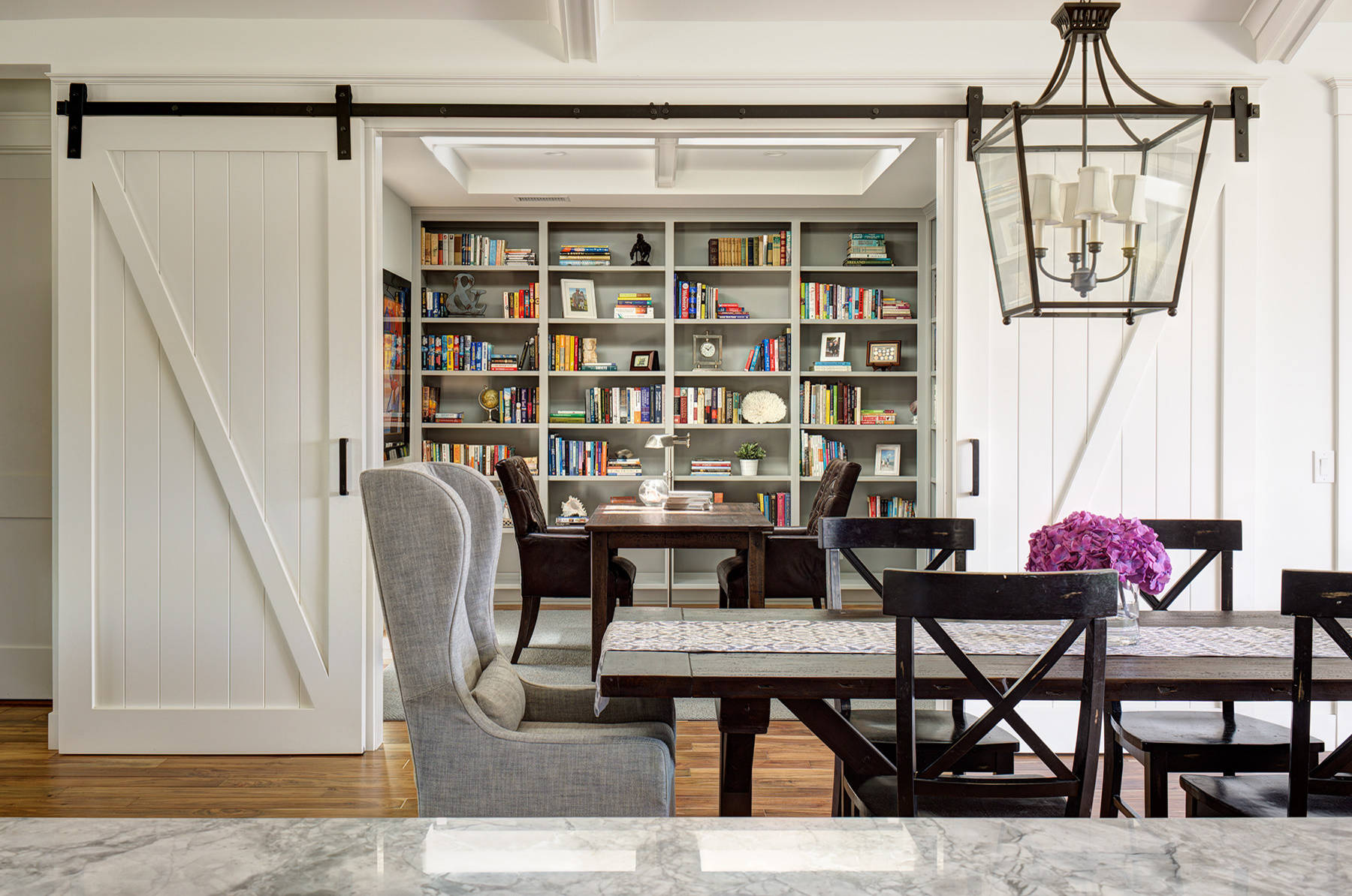 Barn doors usually have an exposed sliding mechanism that can work well as a feature in an industrial scheme. But this is a good example of how to integrate a barn door into a more classic interior by hiding the sliding mechanism behind a slim wall casing, rendering it invisible, and allowing the door to gently slide open and closed as if by magic.