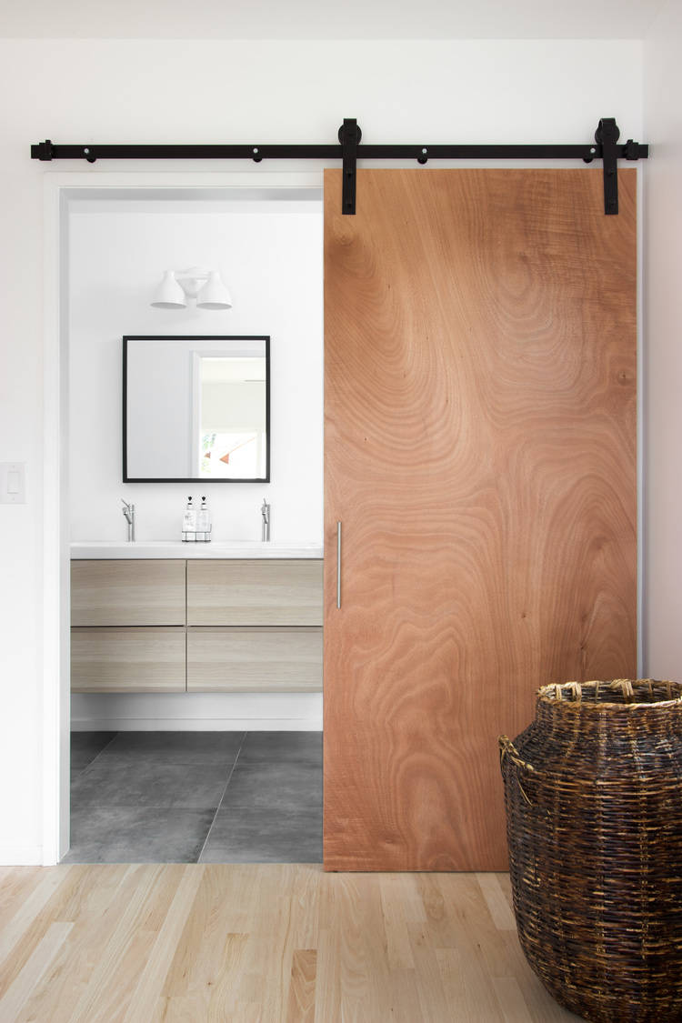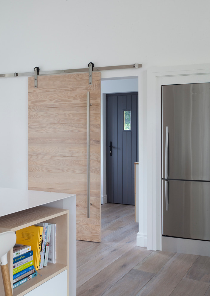While wood panels are traditional for a barn door, a single panel of wood veneer will bring this look right up to date. A door like this slots neatly into a pared-back scheme.