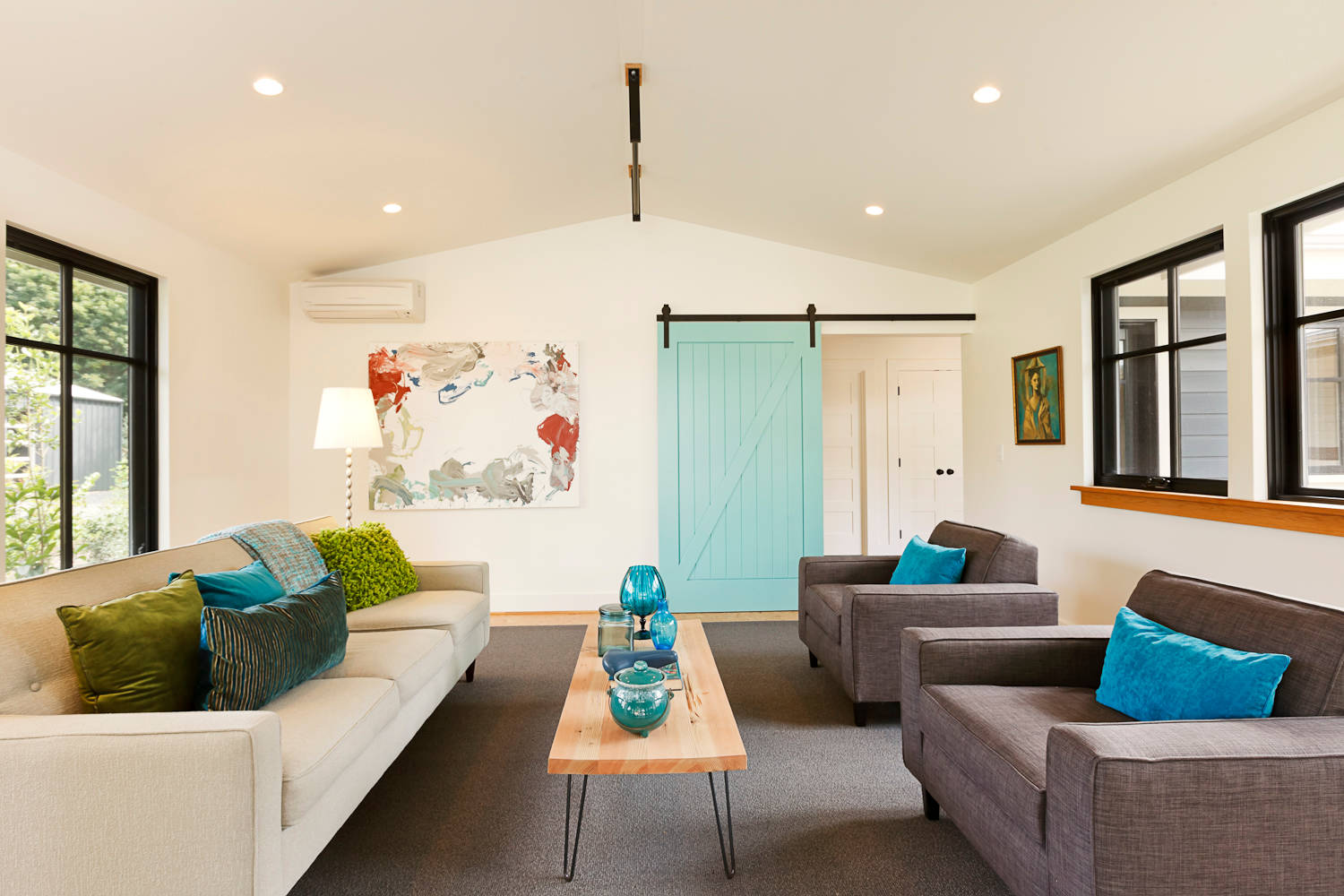 While barn doors can work well individually, a double set creates a pleasing symmetry and sense of order, as demonstrated in this open-plan living space and study. Good for larger scale living rooms, or to create a traditional feel, they can bring a refined ‘modern-country’ feel.