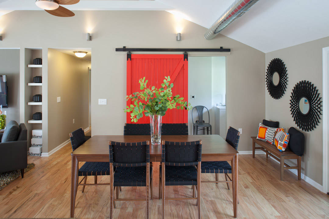 In a room where your sliding door is going to be very much on display, painting it a bright shade means it can take the place of artwork or other accessories, so consider your shade carefully. This cherry-red door covers a lot of the wall space behind the dining table. By painting it such a bold shade, it makes it look like a moving piece of art.