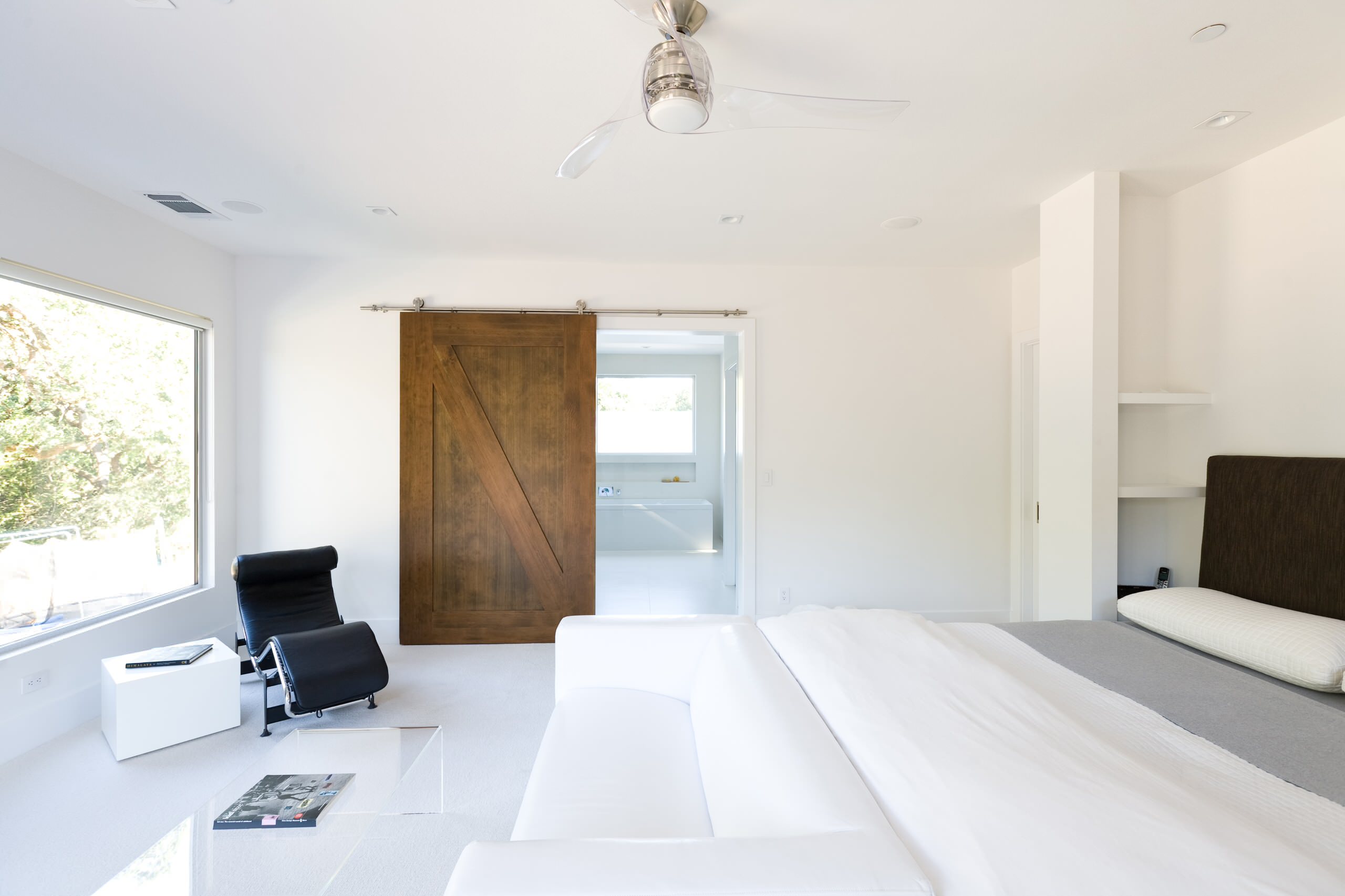 Although this scheme is predominantly white, the black hardware above this barn door neatly echoes the graphic accents of the lighting and artwork in the room beyond, creating a visual link between the two spaces.