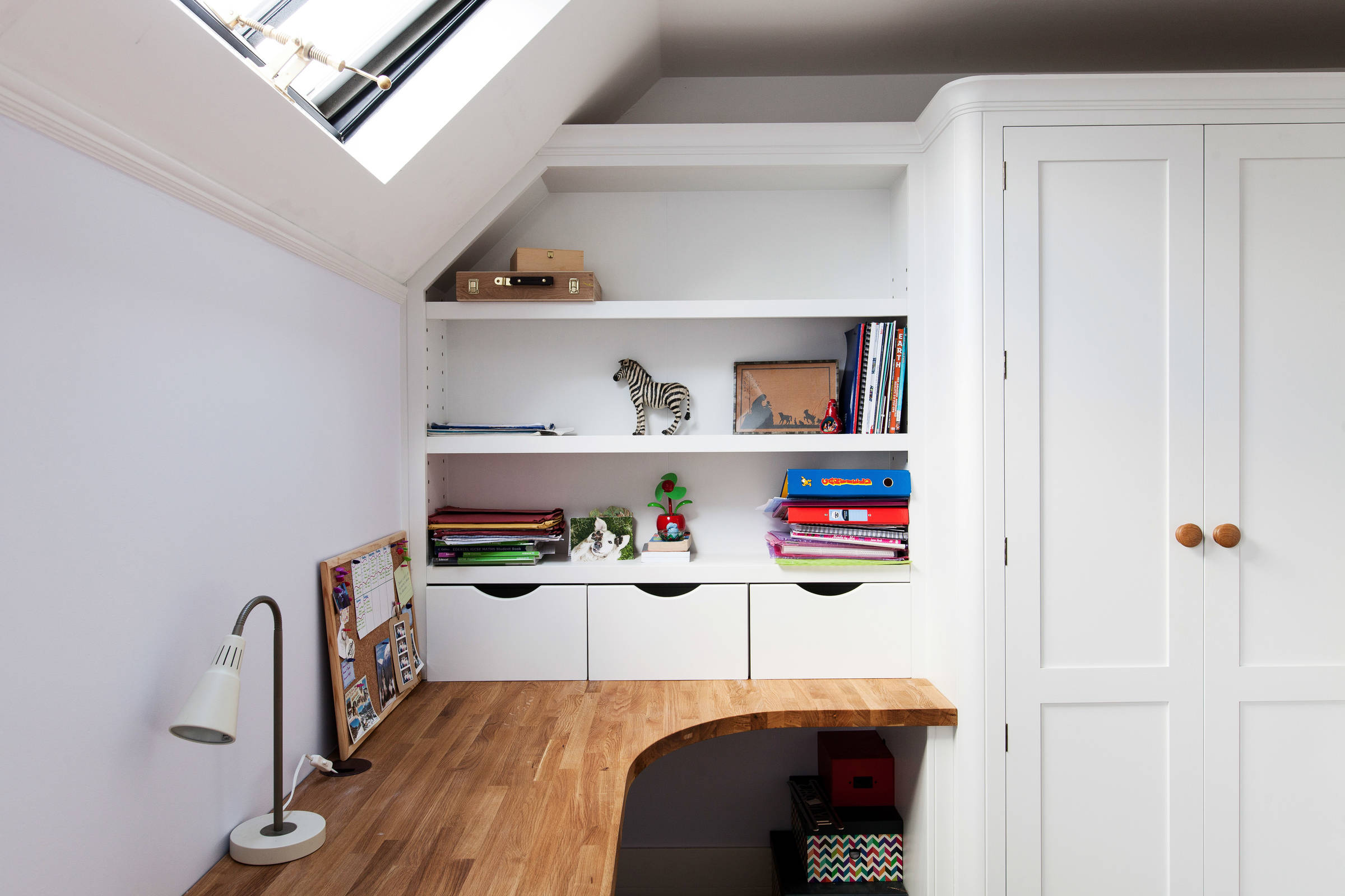 The desk itself is built in over the radiator, with slats to let the heat out and a sinuous shape to make the most of the space.