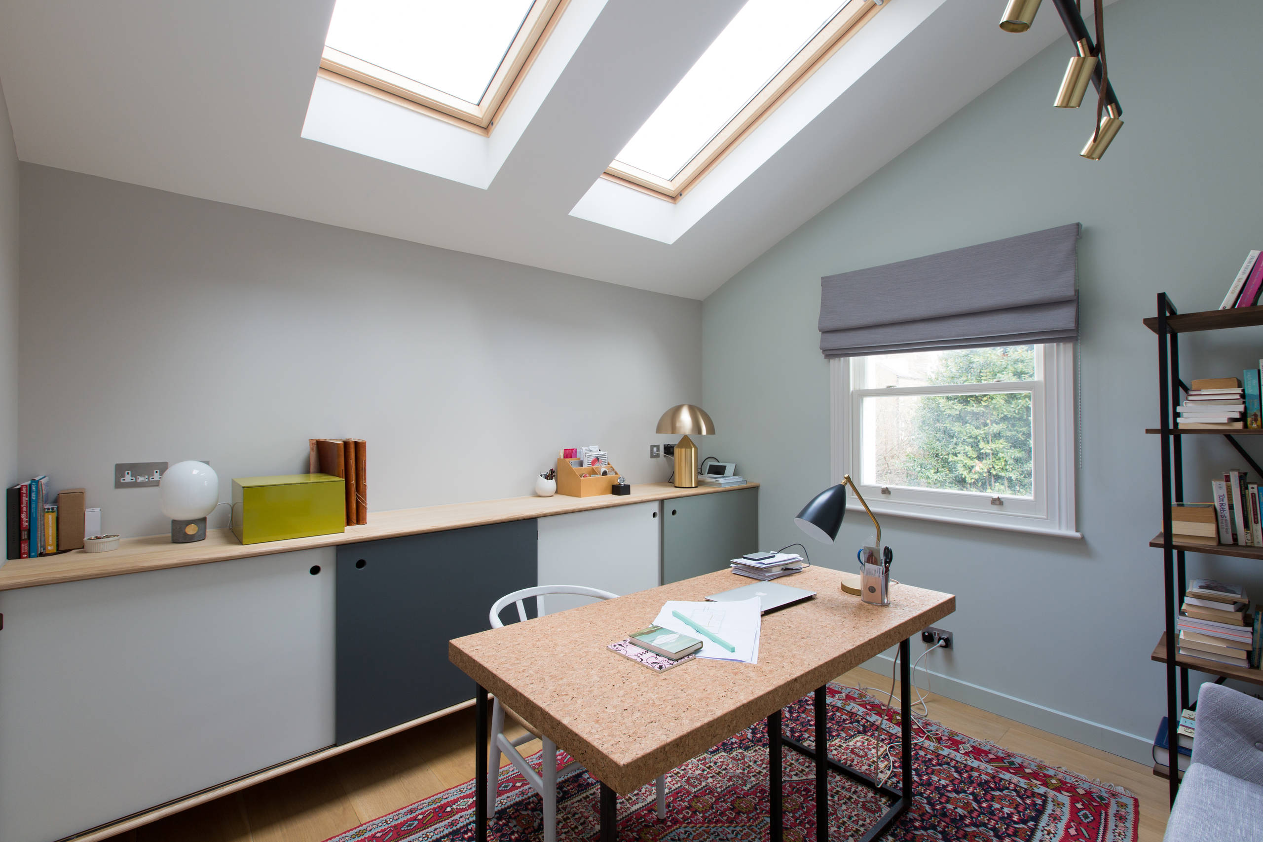 In this room, breaking free from the wall makes space for useful storage instead, with a bank of neat cupboards, while the rug gives the whole space a more homely, less ‘officey’ feel.