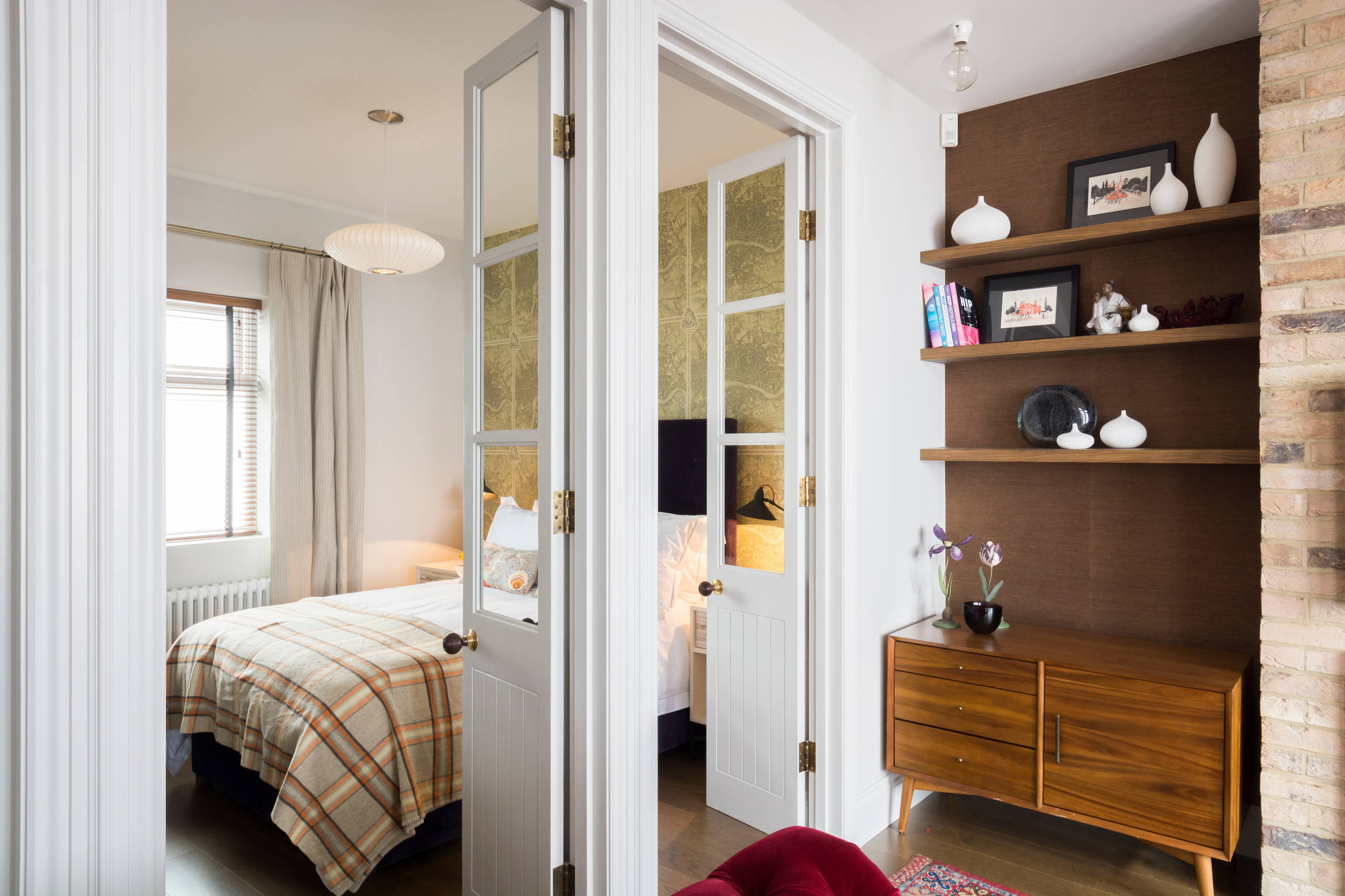 These glass doors divides the sleeping area from the seating zone in this compact flat. If the doors were solid, it would break up the space too much, but the light filtering through to the bedroom from the seating area, even when the doors are closed, and the view from the bedroom to the living room and beyond, means there is a flow between the two at the same time as demarcating each zone.