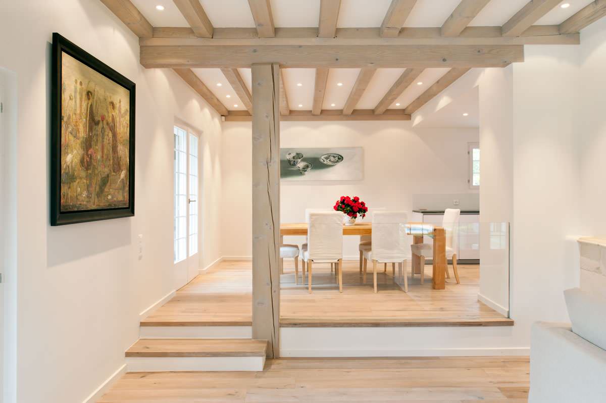 This open-plan space is zoned visually with different floor levels. Using different levels, or even just different flooring, gives a lovely clear sense of ‘rooms within a room’.