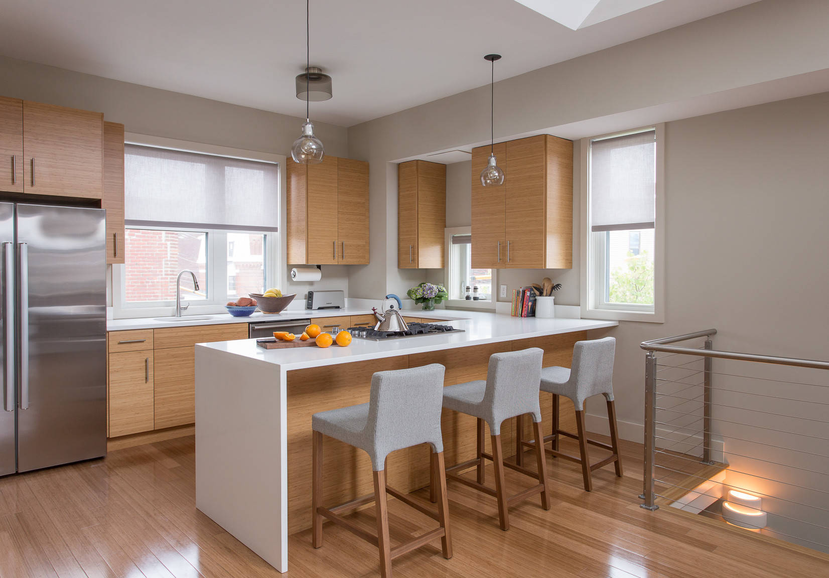 It’s also a solid choice when different wood tones are combined in a room. This kitchen features light wood floors and cabinetry, along with many clean, crisp white elements. The beige wall forms a nice link between the wood and the white.