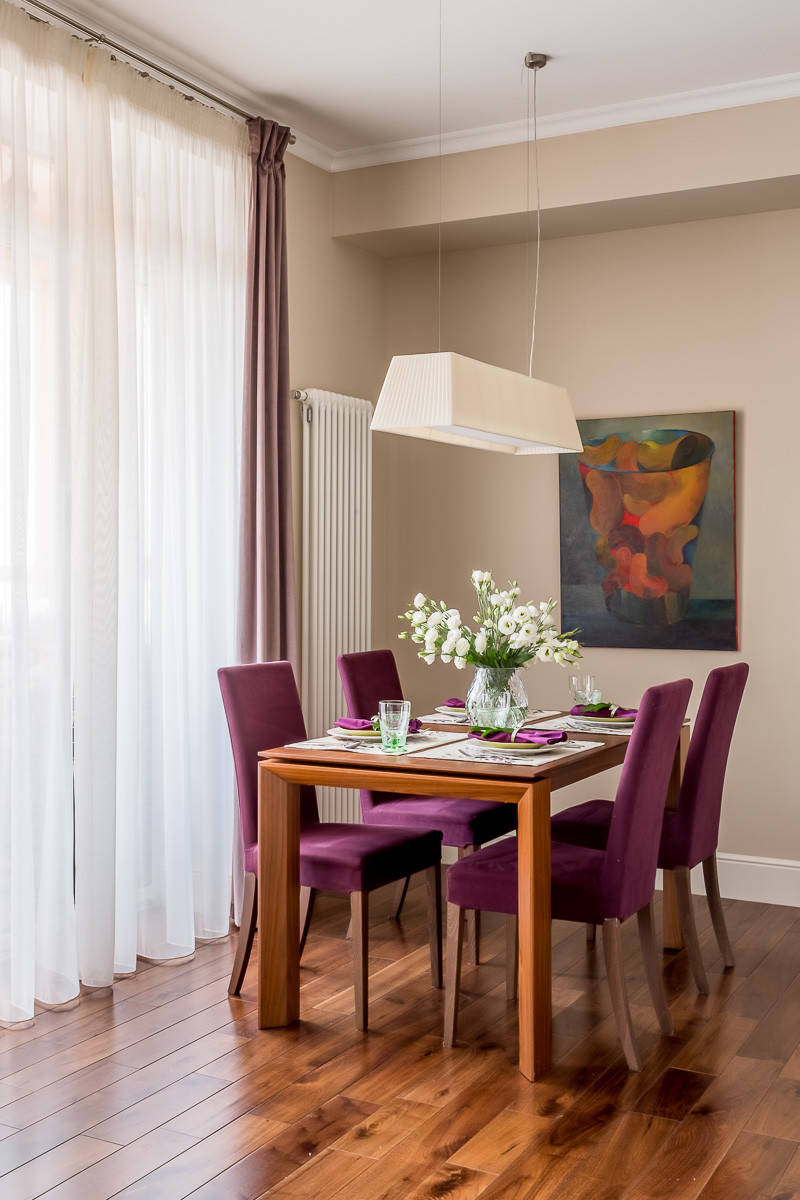 Here’s an example of a warmer beige. This wall colour appears to have orange, almost pink undertones. It therefore pairs nicely with the bolder shots of colour in the room — the orange and red hues in the artwork, and the magenta upholstered dining chairs.