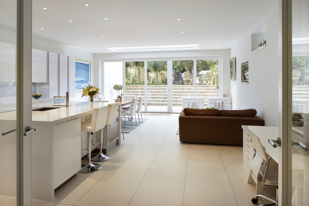 The cleaner and wider the view onto the outside, the bigger your space inside will feel. ‘French doors or double doors and a window all clutter up the back wall and miss the opportunity to show off space,’ says James. ‘But bifolds offer a good view. Even if your garden is not that big, the fact that your eye continues beyond the back of the house and out into the exterior really boosts the sense of space.’