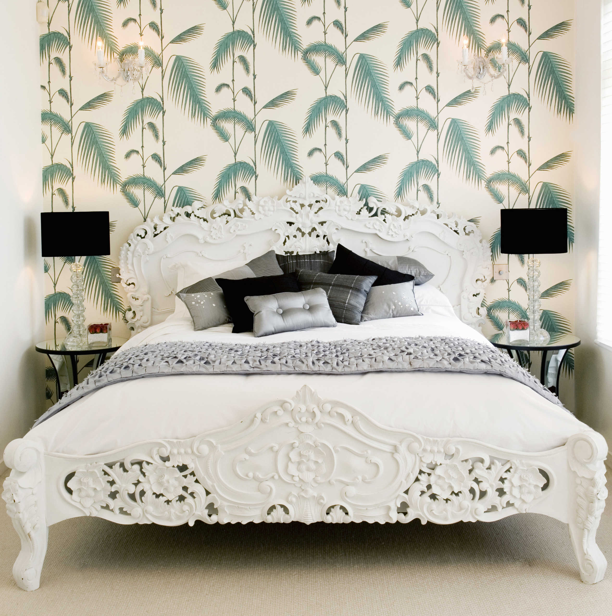 Green doesn’t have to dominate in the bedroom to make an impact. This large palm leaf print paper by Cole & Son is certainly striking, yet creates an easy-on-the-eye background to the white carved bed and piles of silvery cushions. It’s old fashioned sass brought bang up to date for the contemporary home.
