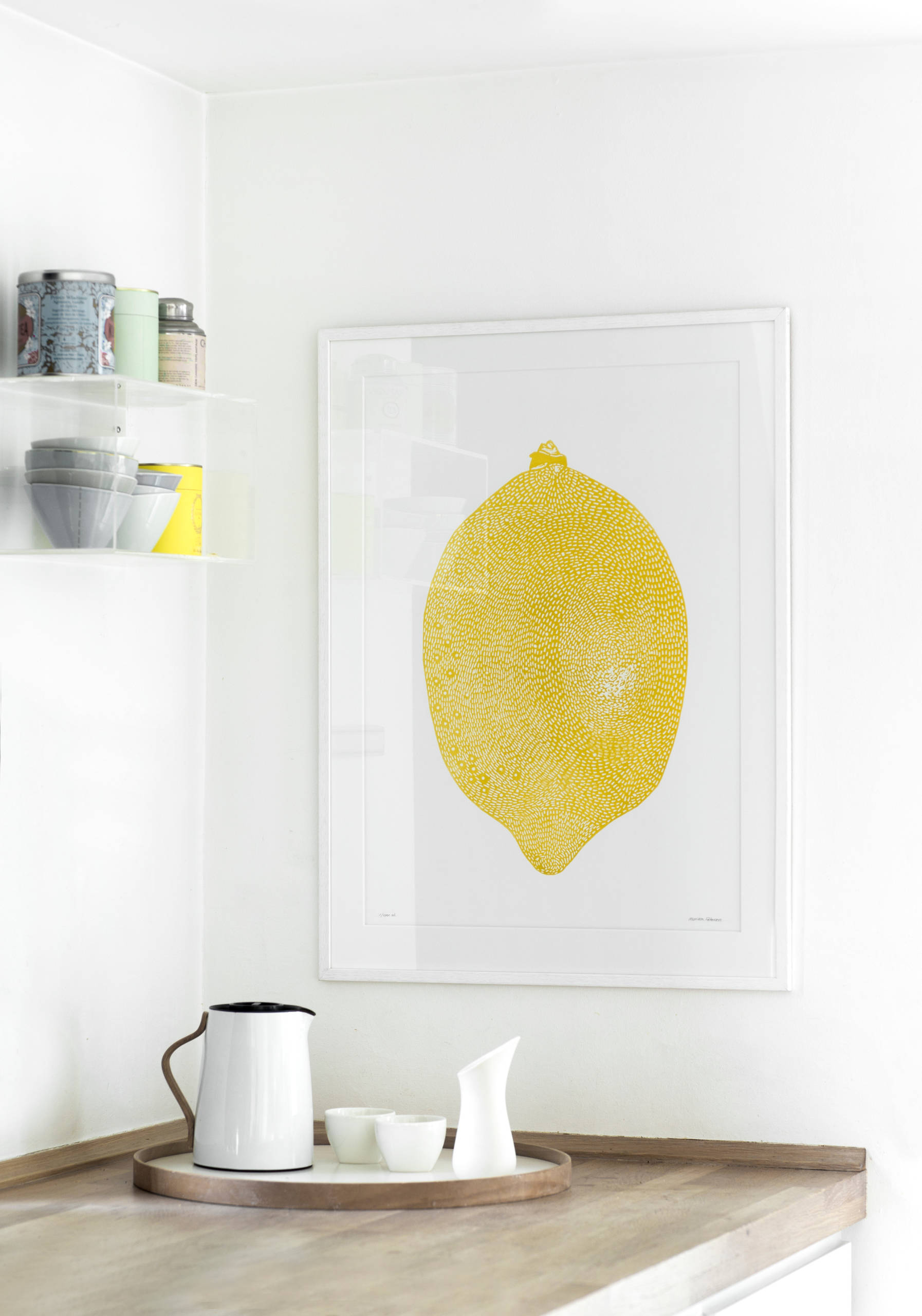 White kitchens are all the rage, but a dash of colour can make them stand out, adding a small twist of individuality. Prints and pictures are a perfect way to introduce an eye-catching feature to a kitchen, as with this zesty yellow lemon print, which is both fitting and sweet. If that isn’t enough, add another yellow accessory, like the little jar here, to consolidate the lemony scheme.