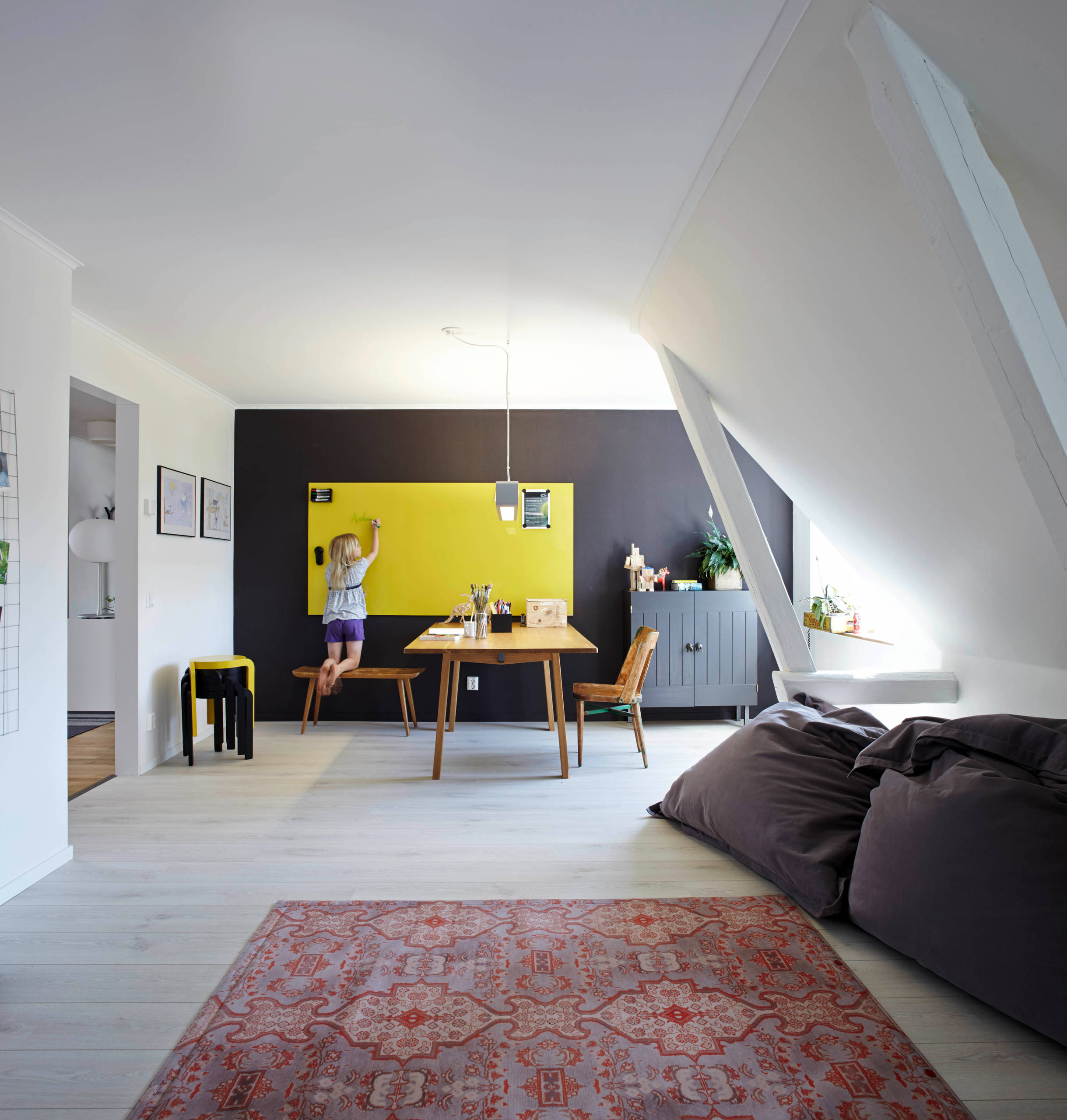 To achieve something like the wall in this room, choose your perfect golden hue and mask out the shape you want to paint. Now for the clever bit: go over the painted area with a transparent magnetic whiteboard paint to create a sunny feature wall that’s interactive, too.