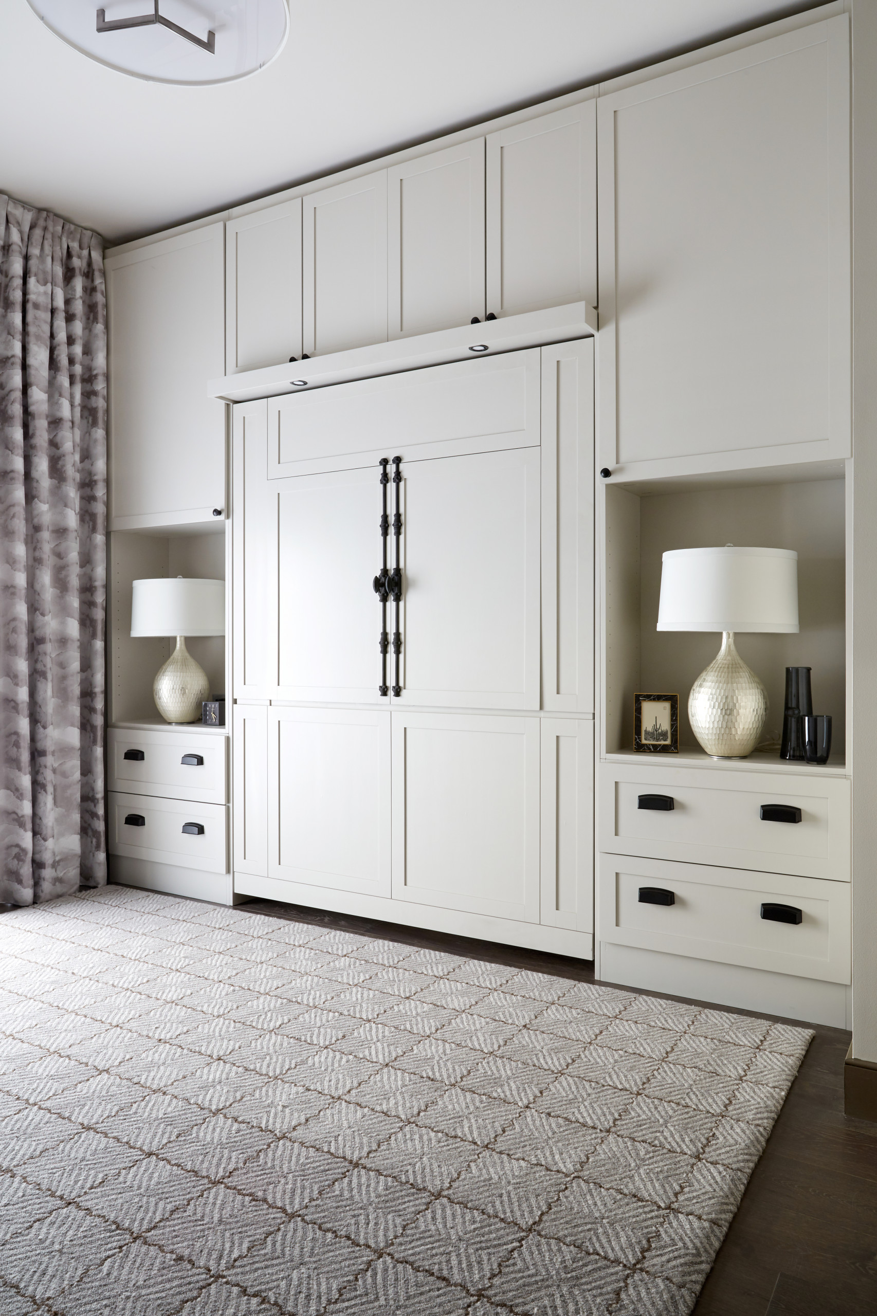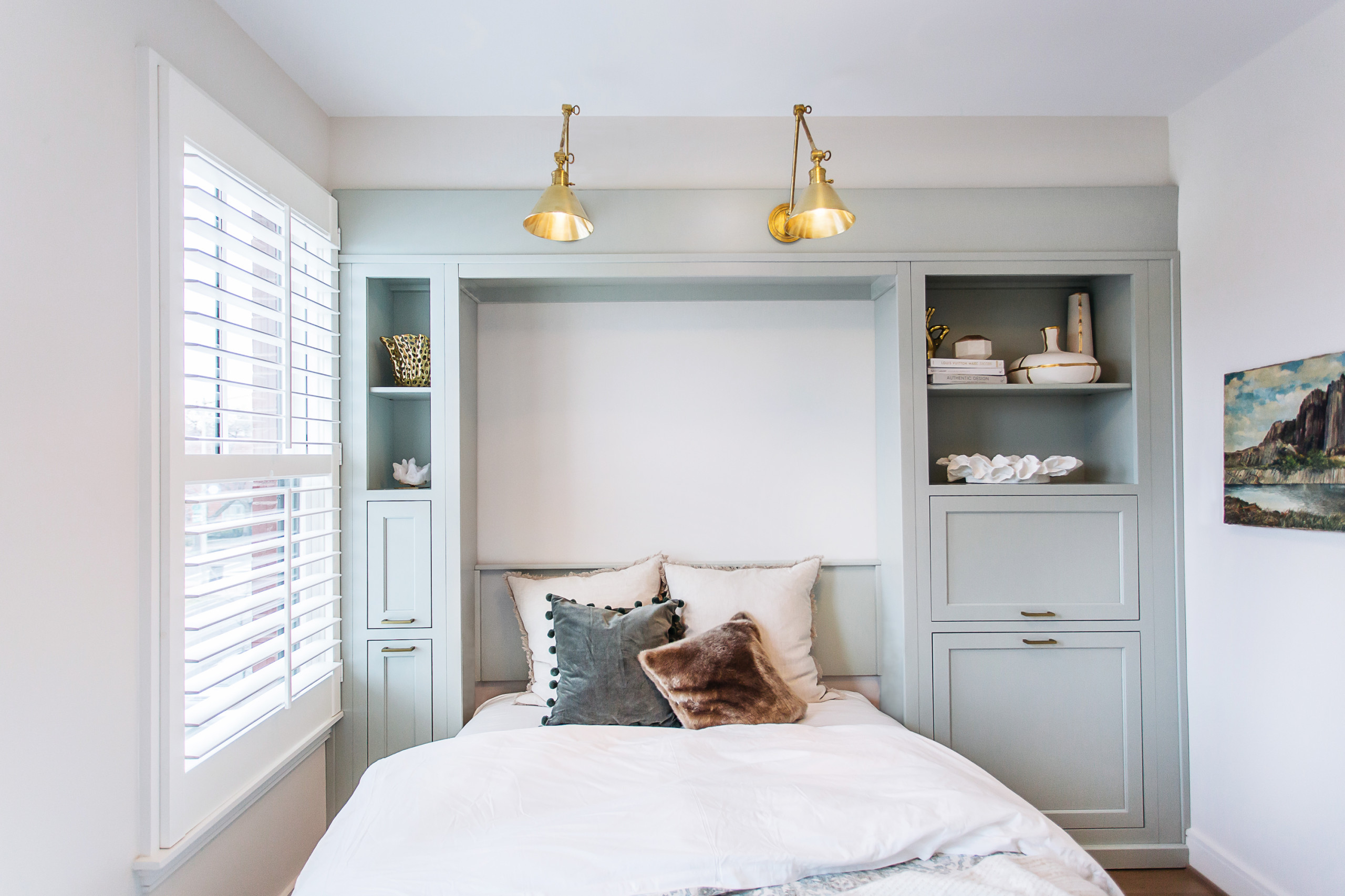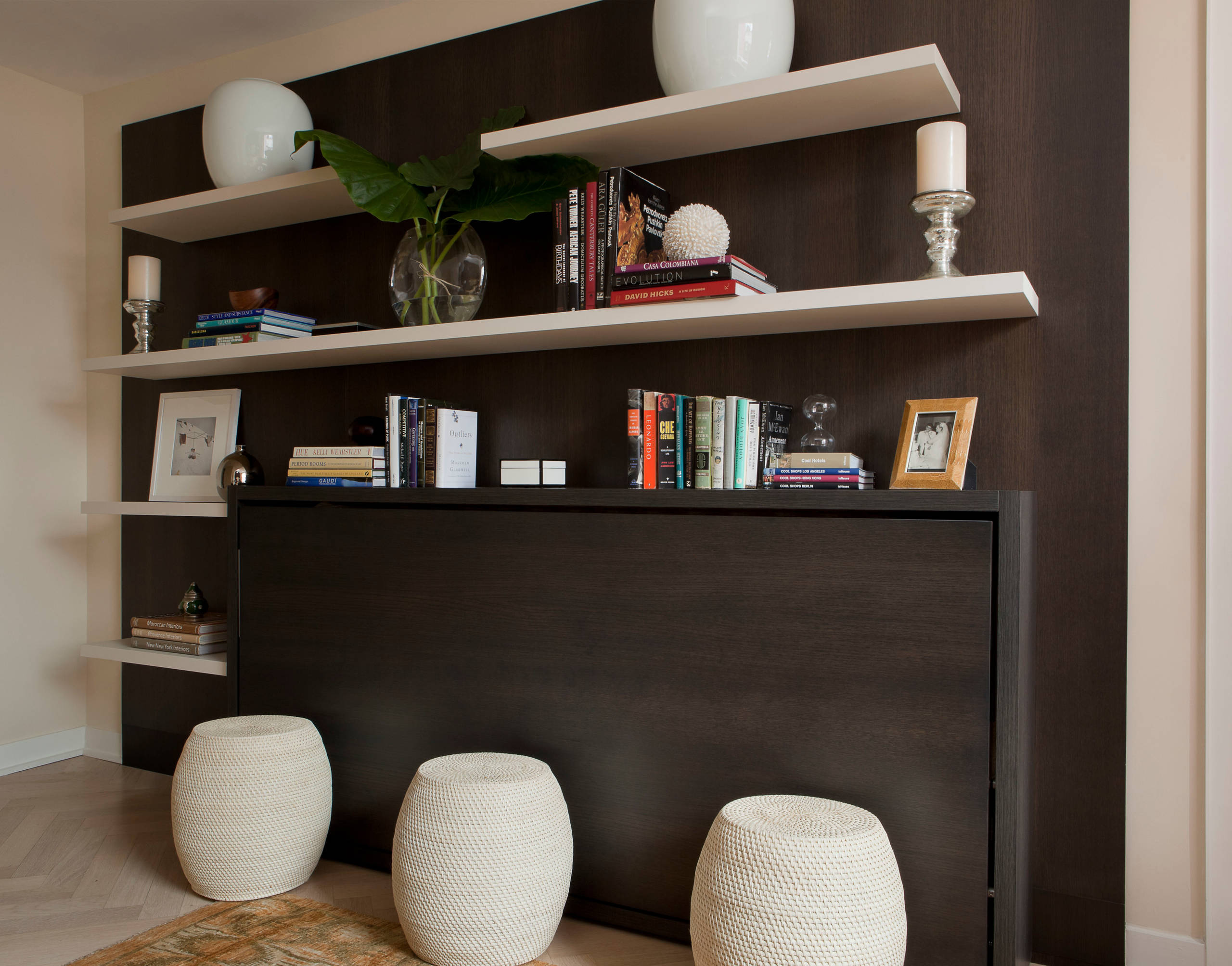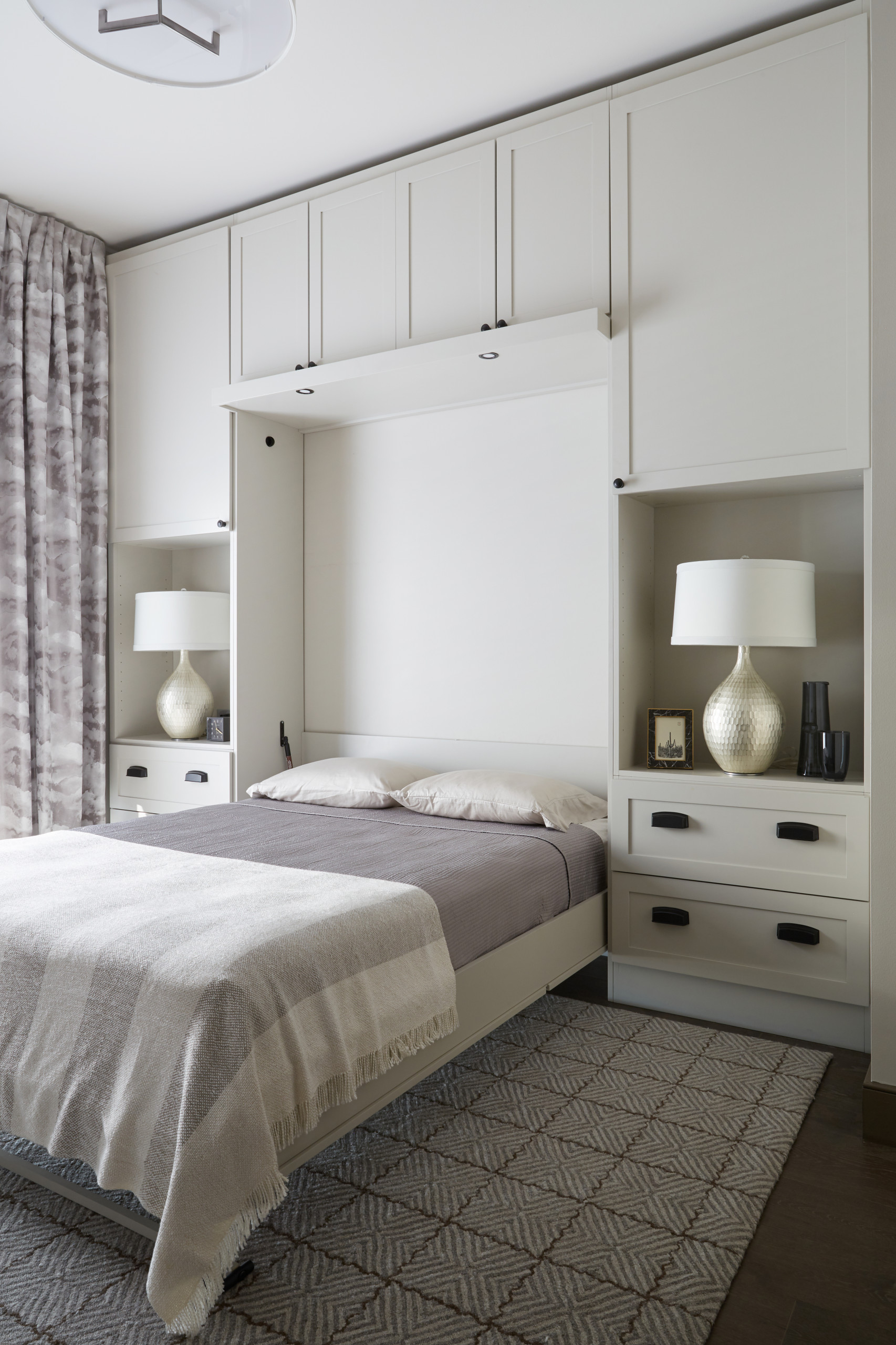 For a really smart space-saving solution, this room by Interior Anthology features a wall bed with an integrated desk, so when the bed is retracted, a section can fold down and transform into a work surface.
