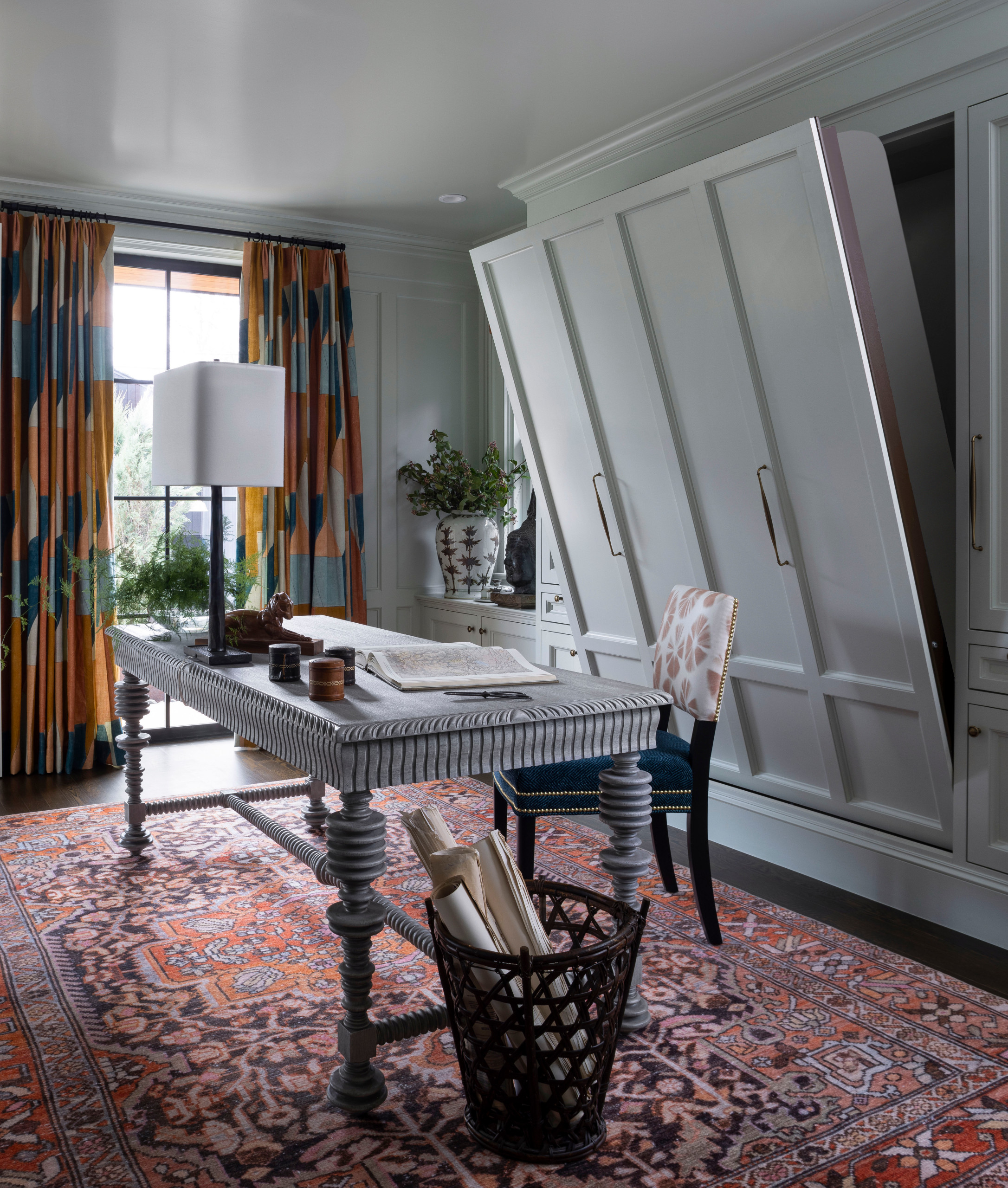 At first glance, this room by Andrea Schumacher Interiors looks like a standard home office with a bank of storage behind the desk. By painting the cupboard the same colour as the walls and ceiling and adding decorative moulding, it blends in seamlessly. You would assume the cupboard was simply storage space.