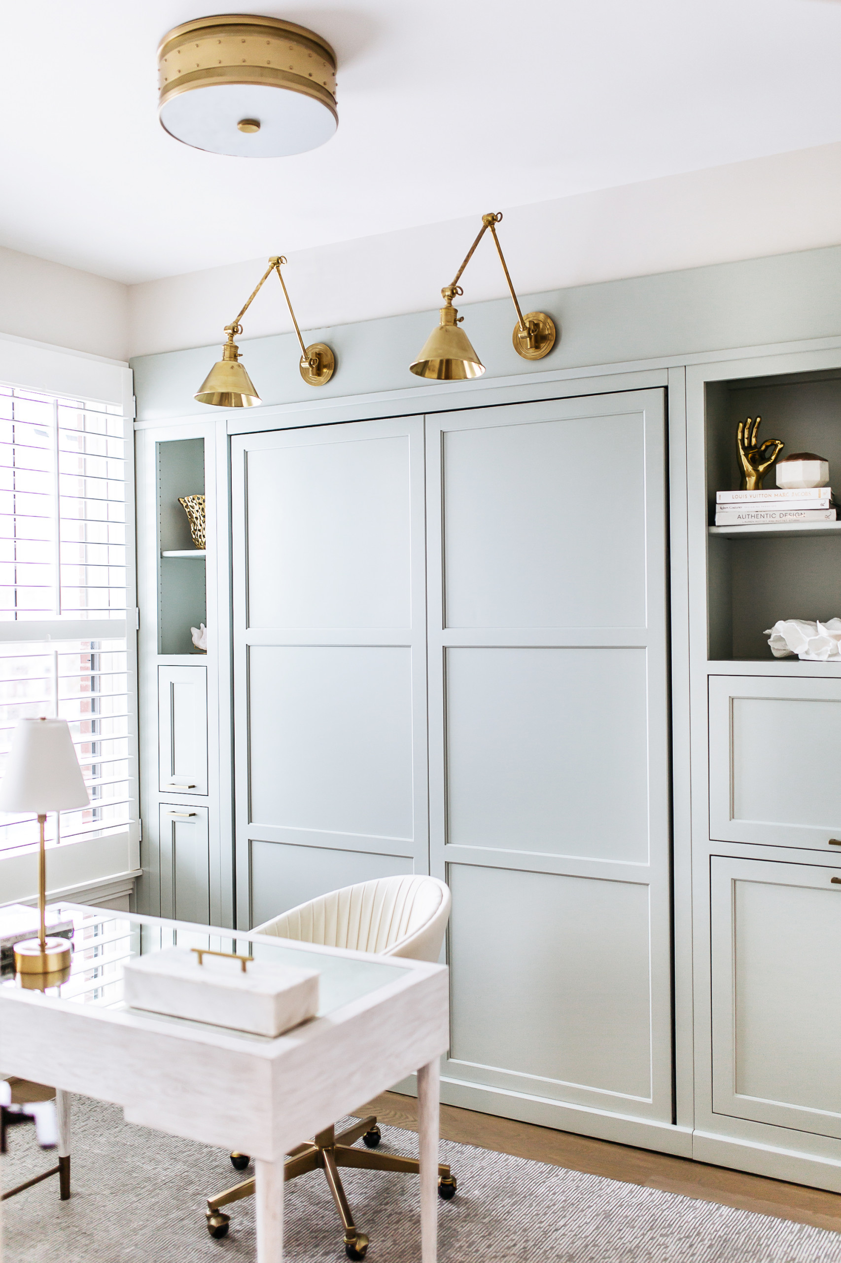 This petite room by Lisa & Leroy needed to serve two roles for the homeowners – be a spare room for guests and a home office for work. A wall bed was the ingenious solution.