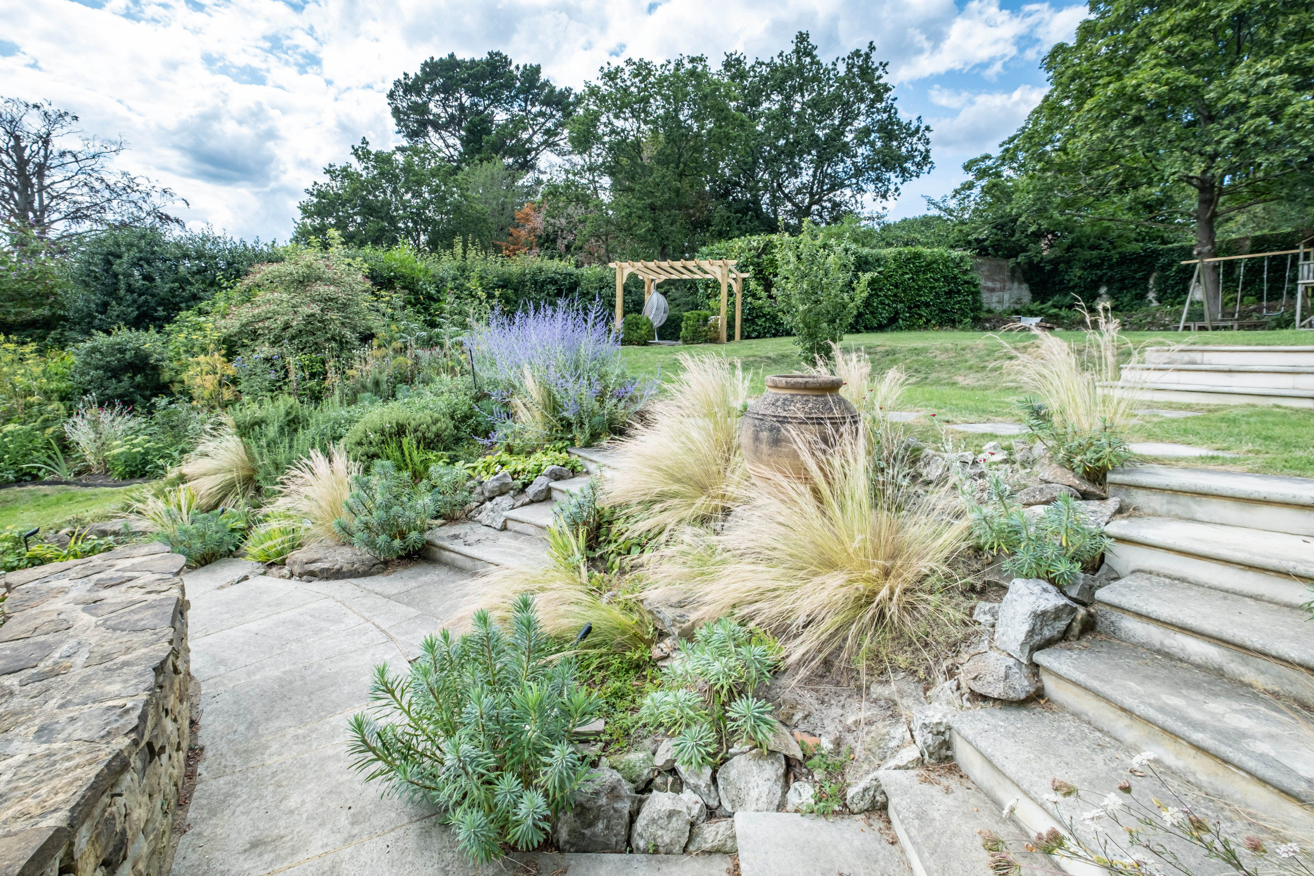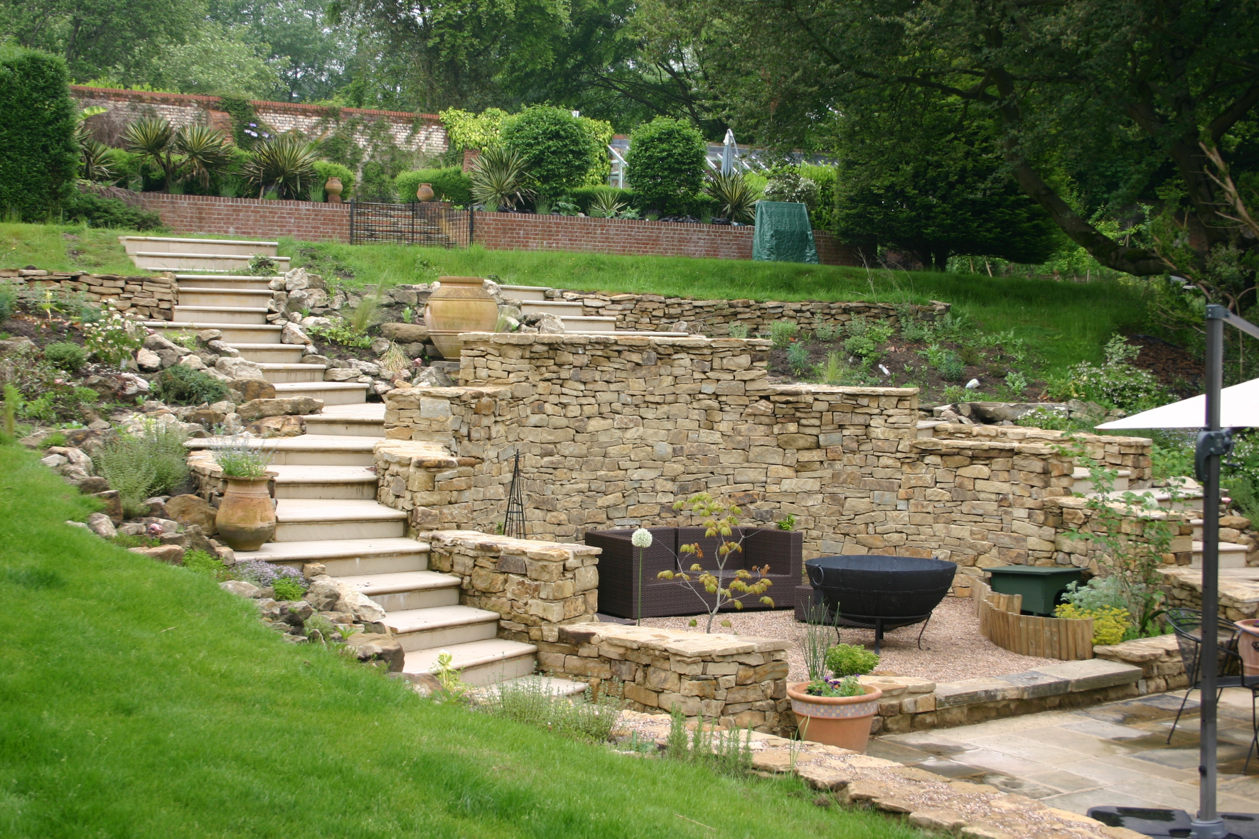 Two more sets of steps continue the curved lines above the dry stone wall garden and lead to an area of lawn. Euphorbia and grasses are planted between them.