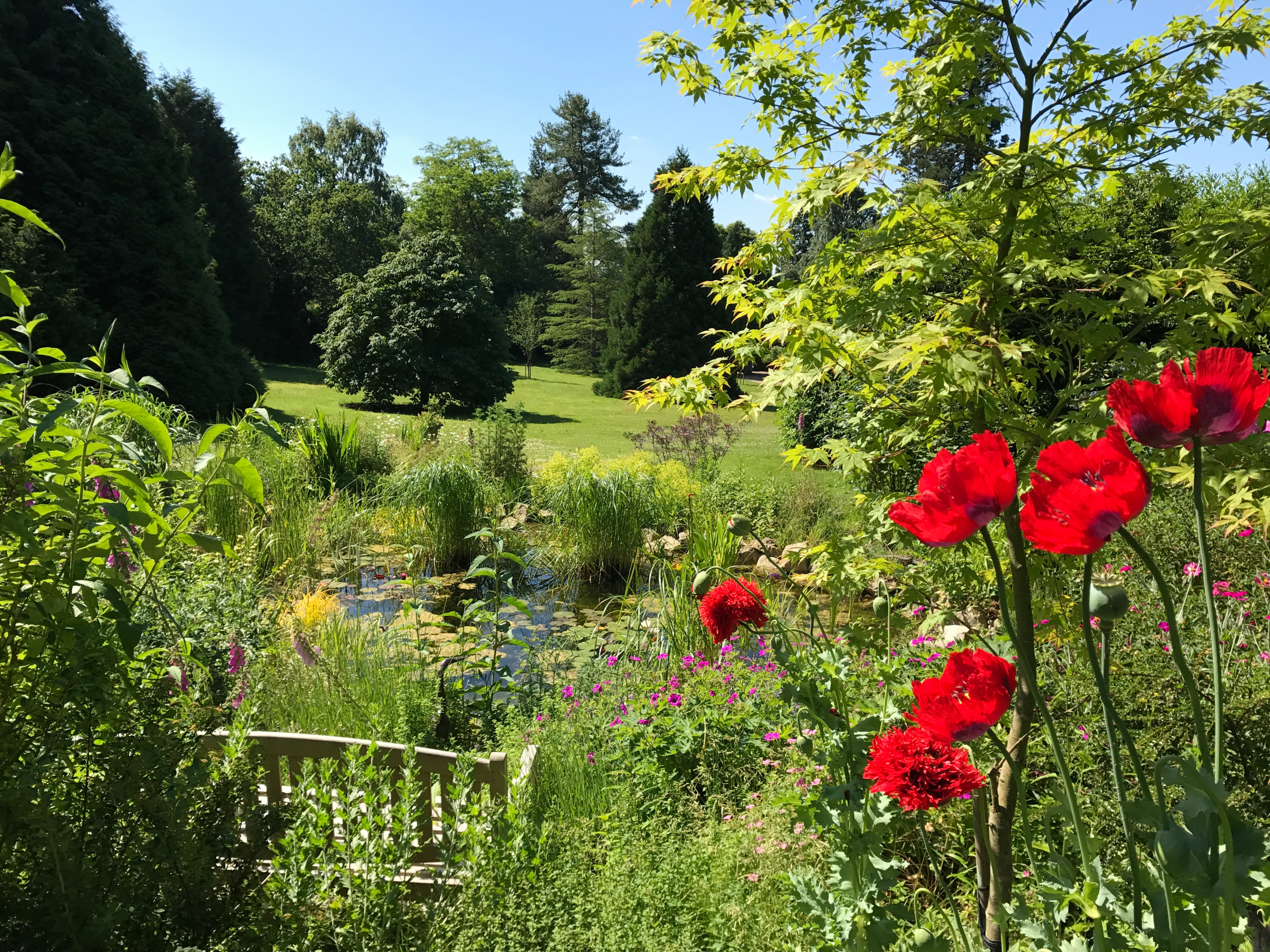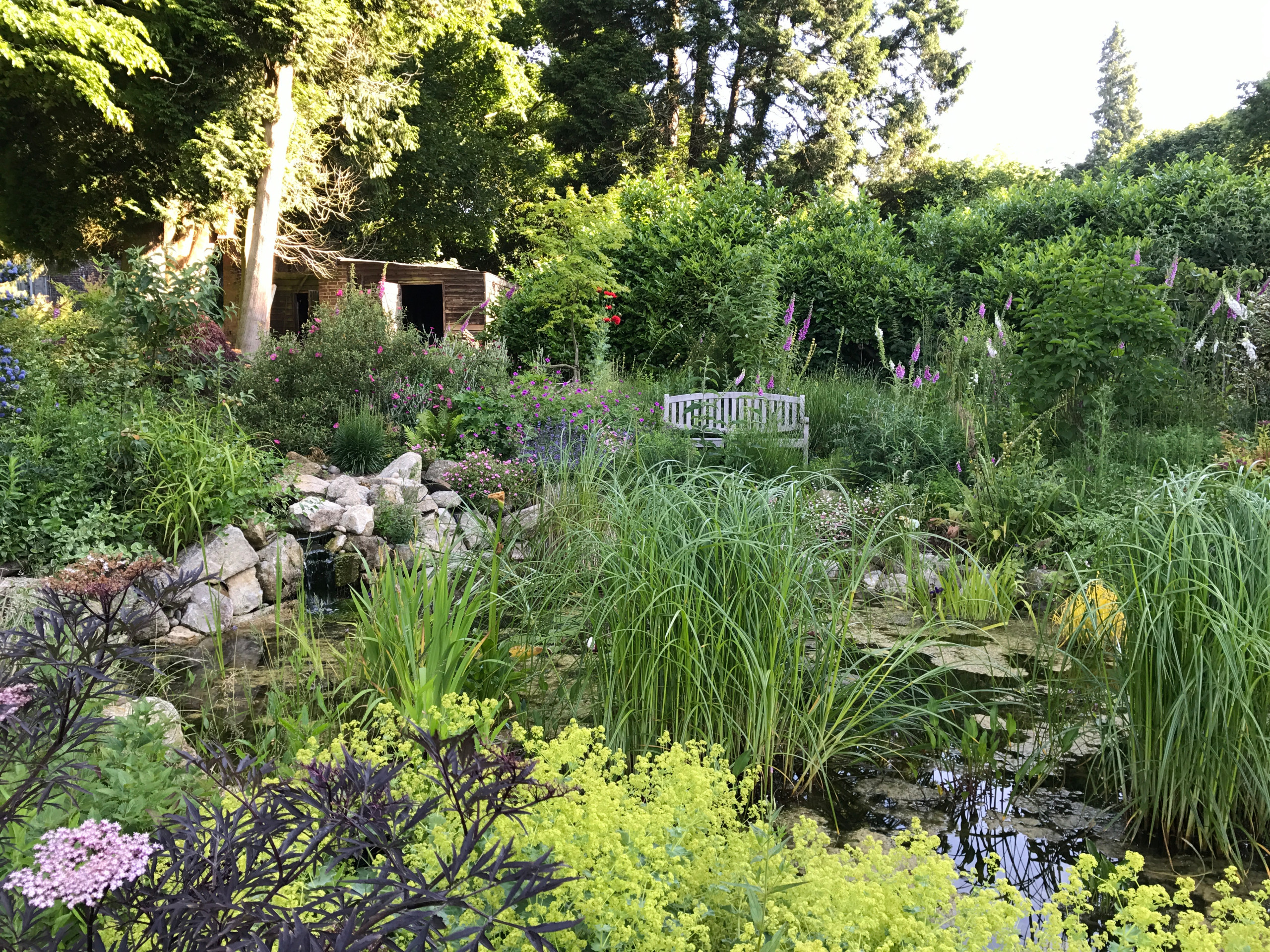Now, the pond is home to newts and dragonflies and won a Surrey Wildlife Trust gold award. The planting around it includes foxgloves, Alchemilla mollis (lady’s mantle, which has frothy, acid green flowers) and Sambucus nigra ‘Black Lace’.