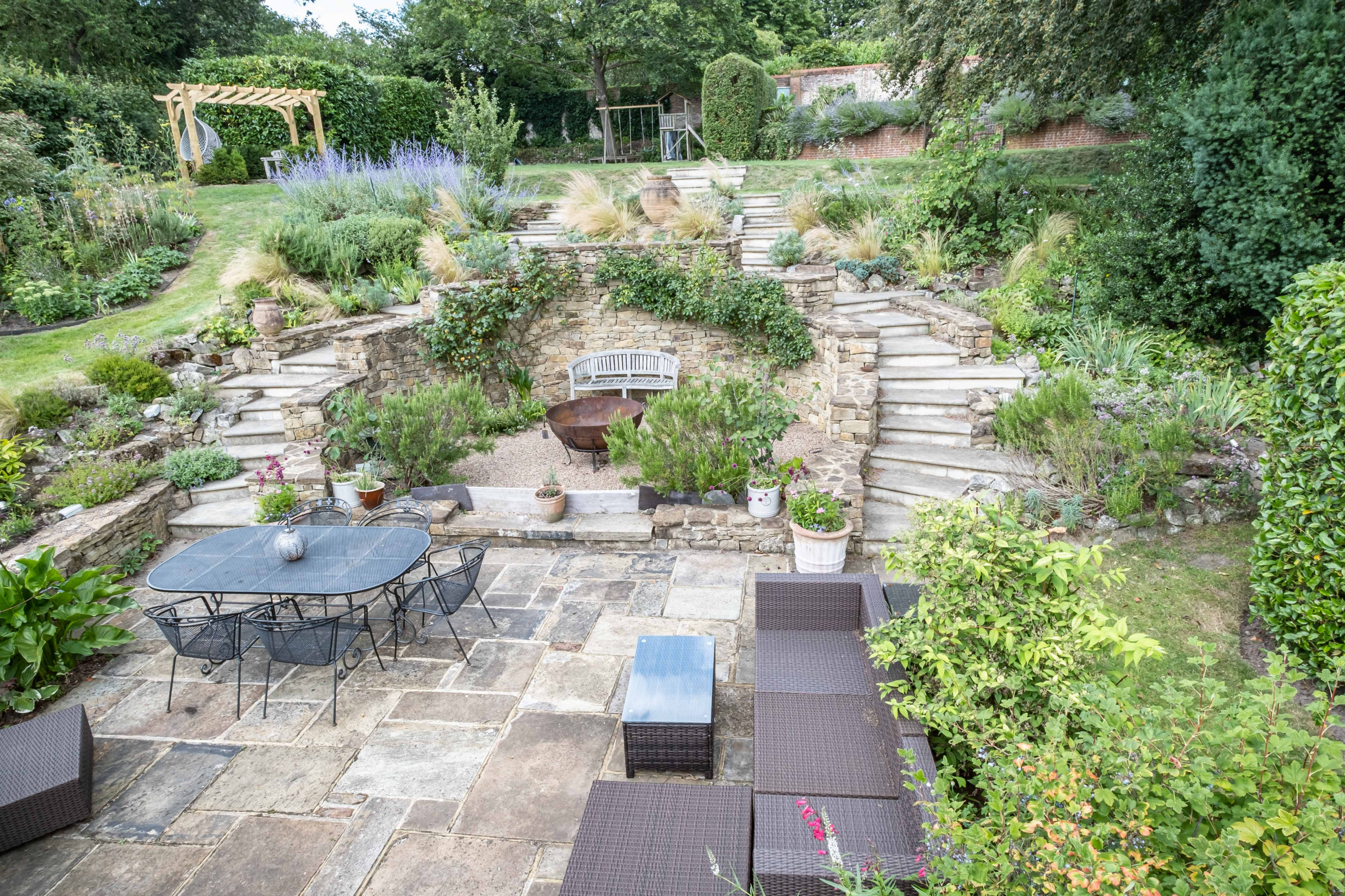 Five years later (when this photo was taken), planting softens the lines of the dry stone wall garden. The rounded shape of the terrace carved into the bank, with steps on either side, creates a cocooning feel.