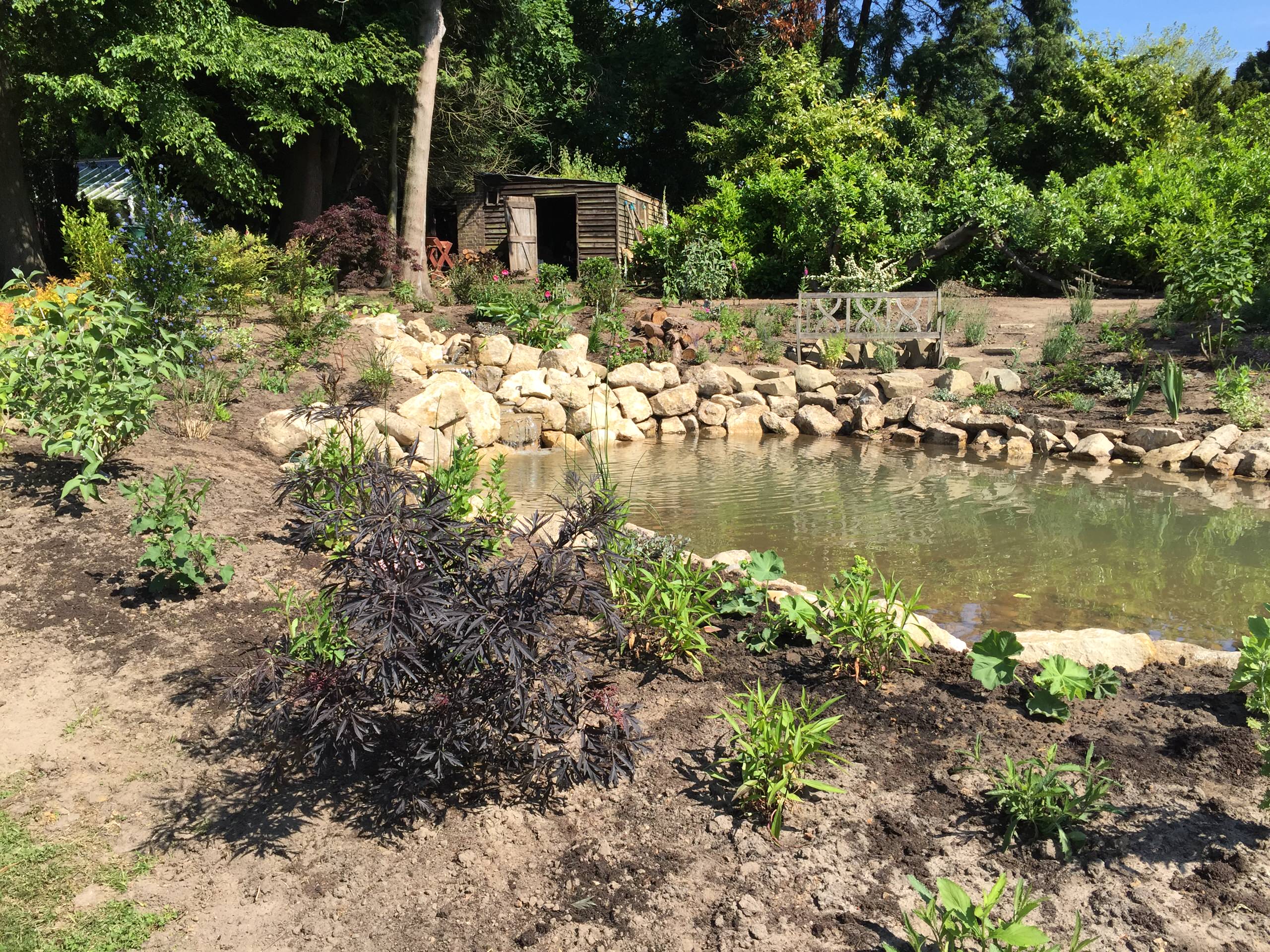 This is the pond looking much sparser immediately upon completion in April 2015. It took two months to create. “You have great views of the garden beyond it,” Kenn says.