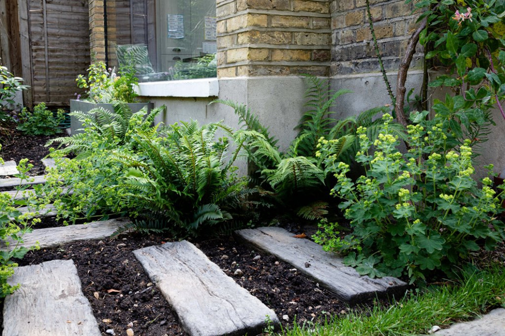 The area under the home’s large rear window is shady, so Tracey opted for plants that would thrive here and create texture. They include evergreen ferns Polystichum setiferum (soft shield fern) and Blechnum spicant (hard fern), as well as Alchemilla mollis (lady’s mantle), and hellebores.