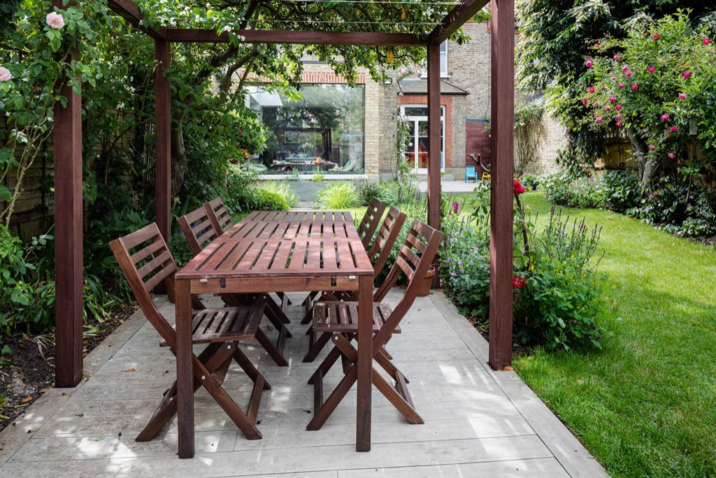 Containing a space for dining and a barbecue, the pergola is an area where Jess and Reuven can chill out, swapping the old shaded terrace for evening sun. “It gives structure,” Tracey says. “There were some trees [here before], but this leads the eye down the garden.”